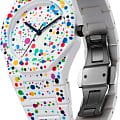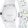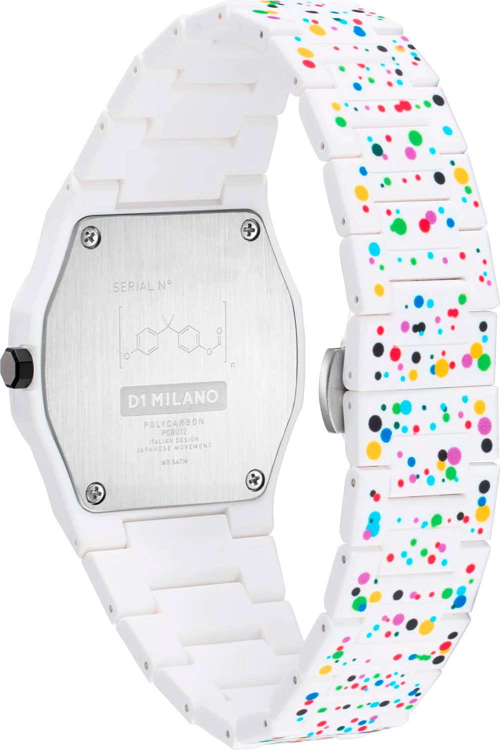 Часы D1 Milano Polycarbon PCBU12 – молодежные часы в стиле унисекс для повседневных образов, стильные и комфортные. Модель Poly Dot имеет белые с цветными брызгами корпус и браслет из поликарбоната с покрытием Софт-Тач. Циферблат лаконичный, защищен минеральным стекломМинеральное стеклоМинеральное стекло представляет собой искусственно выращенный минерал кварца. Такое стекло отличается особой устойчивостью к повреждениям и царапинам. Уступает по некоторым качествам сапфировому стеклу. с антибликовым покрытием. Стальная задняя крышка на 4 винтах. Пластиковый браслет на застёжке-бабочке с кнопкамиЗастёжка "бабочка"Такой вид застёжки дополняется предохранителями, помогающими избежать случайного раскрытия браслета. Обладают изящным исполнением. .