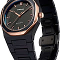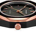 Часы D1 Milano Polycarbon PCBU14 – современные часы в стиле унисекс для повседневных образов. Модель Gold Mesh имеет черный корпус из поликарбоната с покрытием Софт-Тач и полированный стальной безельБезельВнешний ободок, закрепляющий стекло. В спортивных часах так называется поворотное кольцо с делениями на циферблате, выполняет роль таймера – замеряет отрезки времени на шкале. Неподвижный безель – элемент декора. Однонаправленно вращающийся безель на дайверских часах позволяет фиксировать моменты погружения и выныривания на поверхность. с розовым PVD-покрытиемPVDУльтратонкое покрытие наносится в технике вакуумного напыления, сочетает в себе нитрид титана особой прочности со слоем золота или оксида хрома. Несёт в себе декоративную или защитную функцию. и черной эмалью. Циферблат лаконичный с индексами в виде штрихов, защищен минеральным стекломМинеральное стеклоМинеральное стекло представляет собой искусственно выращенный минерал кварца. Такое стекло отличается особой устойчивостью к повреждениям и царапинам. Уступает по некоторым качествам сапфировому стеклу. с антибликовым покрытием. Стальная задняя крышка на 4 винтах. Пластиковый браслет из поликарбоната с покрытием Софт-Тач на застёжке-бабочке с кнопкамиЗастёжка "бабочка"Такой вид застёжки дополняется предохранителями, помогающими избежать случайного раскрытия браслета. Обладают изящным исполнением. . Для тех, кто умеет ценить индивидуальность.
