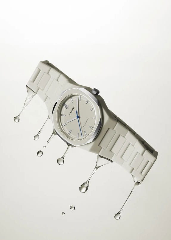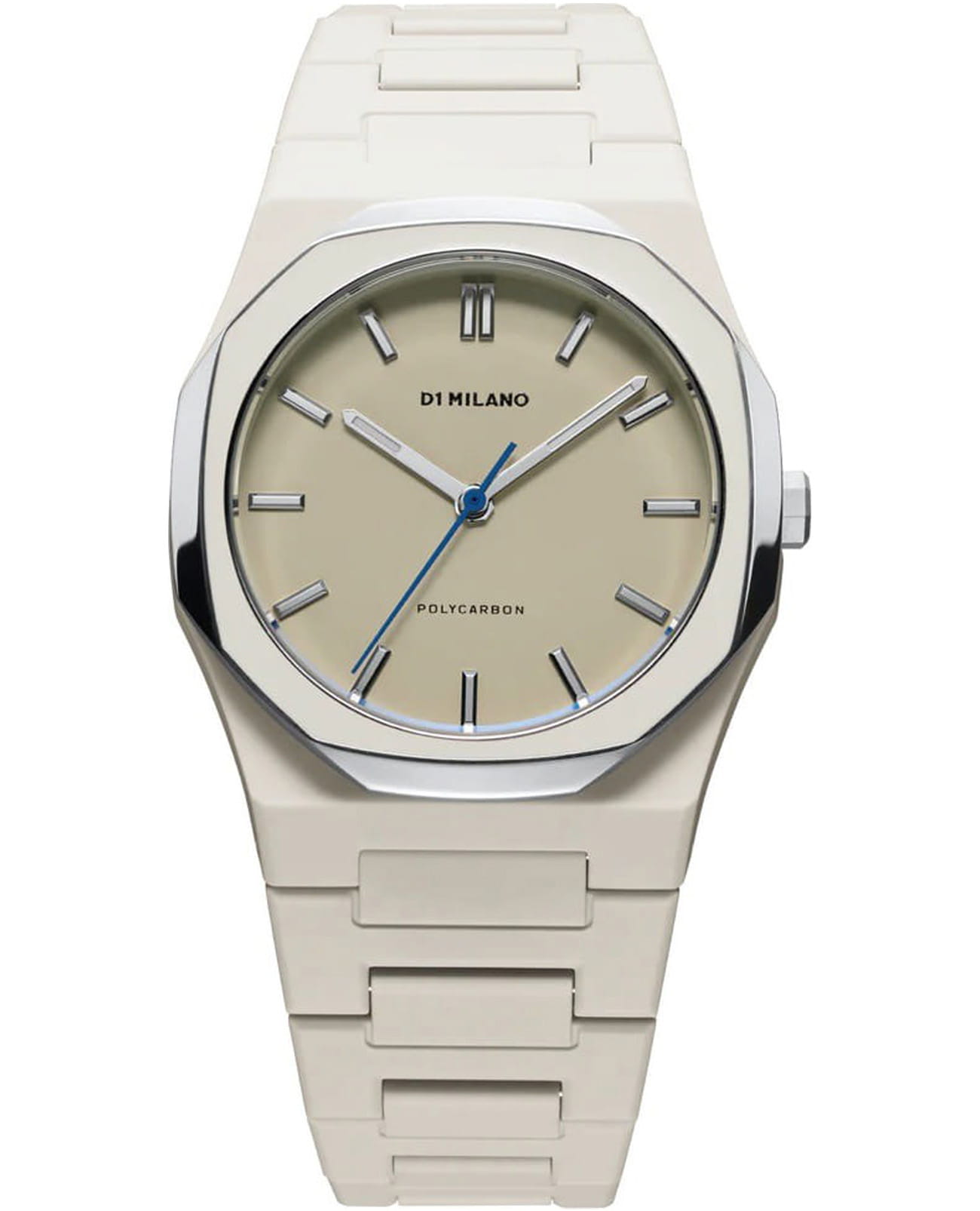 Часы D1 Milano Polycarbon Grey Mesh PCBU16 – современные часы для повседневных образов. Модель имеет серо-бежевый корпус из поликарбоната с покрытием Софт-Тач и полированный стальной безельБезельВнешний ободок, закрепляющий стекло. В спортивных часах так называется поворотное кольцо с делениями на циферблате, выполняет роль таймера – замеряет отрезки времени на шкале. Неподвижный безель – элемент декора. Однонаправленно вращающийся безель на дайверских часах позволяет фиксировать моменты погружения и выныривания на поверхность. с эмалью. Циферблат матовый и лаконичный с индексами в виде штрихов, защищен минеральным стекломМинеральное стеклоМинеральное стекло представляет собой искусственно выращенный минерал кварца. Такое стекло отличается особой устойчивостью к повреждениям и царапинам. Уступает по некоторым качествам сапфировому стеклу. с антибликовым покрытиемАнтибликовое покрытиеСлой оксида металла в 0,13-0,3 микрон, благодаря которому стекло часов не бликует и не отражает свет. Антибликовое покрытие уменьшает отражение света в 10 раз, обеспечивая отличную читаемость показателей циферблата.. Изысканные стрелки выполнены из латуни с люминесцентным покрытиемЛюминесцентное покрытиеПозволяет считывать показания времени в темноте. Производители наносят на стрелки, часовые индексы, безель или поверхность циферблата светонакопительный состав, дающий холодное свечение., гармонично дополняющим общий дизайн модели. Задняя крышка закреплена на 4 винтах, что обеспечивает надежность конструкции. Элегантный пластиковый браслет с покрытием Софт-Тач на застёжке-бабочкеЗастёжка "бабочка"Такой вид застёжки дополняется предохранителями, помогающими избежать случайного раскрытия браслета. Обладают изящным исполнением. . Водозащита 50 метров защищает часы от брызг и дождя, делая их подходящими для повседневного использования. D1 Milano – для тех, кто умеет ценить индивидуальность.