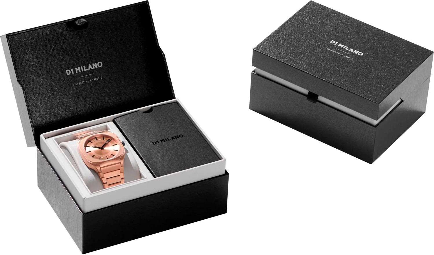 Часы D1 Milano SQBJ04 — это уникальные кварцевые часы, которые подчеркнут ваш изысканный стиль. Эти наручные часы с эффектным монохромным дизайном станут выразительным акцентом вашего образа. Квадратный корпус из стали с сатинированной отделкой, PVDPVDУльтратонкое покрытие наносится в технике вакуумного напыления, сочетает в себе нитрид титана особой прочности со слоем золота или оксида хрома. Несёт в себе декоративную или защитную функцию. покрытием и габаритами 37х37 мм придает часам современный и утонченный вид. Золотистый циферблат, выполненный по технологии Sunray, украшен накладными метками в виде штрихов, а черные хроматические стрелки и индексы создают стильный контраст, подчёркивая элегантность модели. Задняя крышка из нержавеющей стали закреплена на 4-х винтах и дополнена индивидуальным серийным номером, что подчеркивает уникальность каждого экземпляра. Стальной браслет с PVDPVDУльтратонкое покрытие наносится в технике вакуумного напыления, сочетает в себе нитрид титана особой прочности со слоем золота или оксида хрома. Несёт в себе декоративную или защитную функцию. покрытием и раскладной застёжкойРаскладная застёжкаТакой тип застёжки используется только на браслетах из металла. Она никогда не раскрывается полностью, происходит разделение на 2 и более частей. Раскладывающая застёжка снизит вероятность потери часов к минимуму. обеспечивает надежность и комфорт в повседневном использовании. Сапфировое стеклоСапфировое стеклоПрочный и надёжный материал из кристалла сапфира синтетического происхождения, характеризующийся особой твёрдостью и устойчивостью к царапинам и повреждениям. с антибликовым покрытием защищает циферблат, а водозащита до 50WR делает эти часы практичным выбором для любых условий. Благодаря калибру Miyota 1L22, они отличаются точностью и надежностью. Эти итальянские часы представляют собой идеальное сочетание традиционного мастерства и инновационного подхода, воплощая в себе новый взгляд на классическую элегантность.