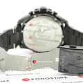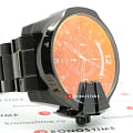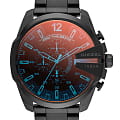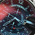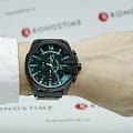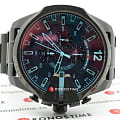 Футуристический циферблат, напоминающий приборную панель гоночного автомобиля, переливается голубым и оранжевым цветом в зависимости от поворота запястья. Стальные корпус и браслет имеют чёрное PVD-покрытиеPVDУльтратонкое покрытие наносится в технике вакуумного напыления, сочетает в себе нитрид титана особой прочности со слоем золота или оксида хрома. Несёт в себе декоративную или защитную функцию., защищающее от царапин.. Высокоточный кварцевый механизм. Люминесцентная подсветкаЛюминесцентное покрытиеПозволяет считывать показания времени в темноте. Производители наносят на стрелки, часовые индексы, безель или поверхность циферблата светонакопительный состав, дающий холодное свечение.. Минеральное стекло. Заводная головка с защитой. Водостойкость до 100 метров. ХронографХронографФункция позволяет измерять отрезки времени с особой точностью: часы, минуты, секунды. Верным признаком хронографа является наличие на циферблате 3 дополнительных окошек-счётчиков., секундомер, отображение даты. Габариты: 55 x 51 x 14 мм.