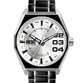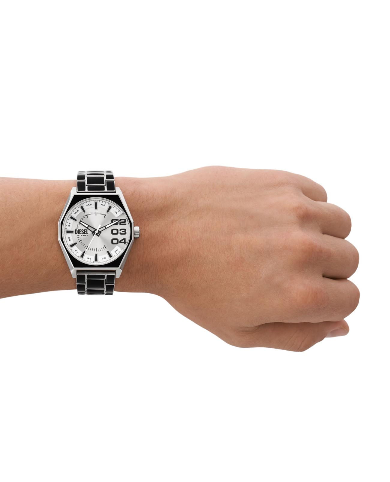 Мужские наручные часы с минеральным стекломМинеральное стеклоМинеральное стекло представляет собой искусственно выращенный минерал кварца. Такое стекло отличается особой устойчивостью к повреждениям и царапинам. Уступает по некоторым качествам сапфировому стеклу. Diesel Scraper DZ2195, кварцевый механизм с высокой точностью. Класс водозащиты: 50 метров, позволит защитить корпус от случайных брызг или капель дождя. Корпус и браслет часов изготовлены из нержавеющей стали. Стальной браслет с частичным IP-покрытиемIP-покрытиеМетод ионного напыления. Демонстрирует повышенную устойчивость к истиранию, окислению и химическим веществам. Под воздействием высокого давления и температуры около 1500°C молекулы металла надёжно соединяются с частицами корпуса часов. на раскладной застёжкеРаскладная застёжкаТакой тип застёжки используется только на браслетах из металла. Она никогда не раскрывается полностью, происходит разделение на 2 и более частей. Раскладывающая застёжка снизит вероятность потери часов к минимуму.. Метки в виде штрихов и арабских цифр. Циферблат выполнен по технологии Sunray (солнечные лучи). Стрелки и метки с люминесцентным покрытиемЛюминесцентное покрытиеПозволяет считывать показания времени в темноте. Производители наносят на стрелки, часовые индексы, безель или поверхность циферблата светонакопительный состав, дающий холодное свечение..