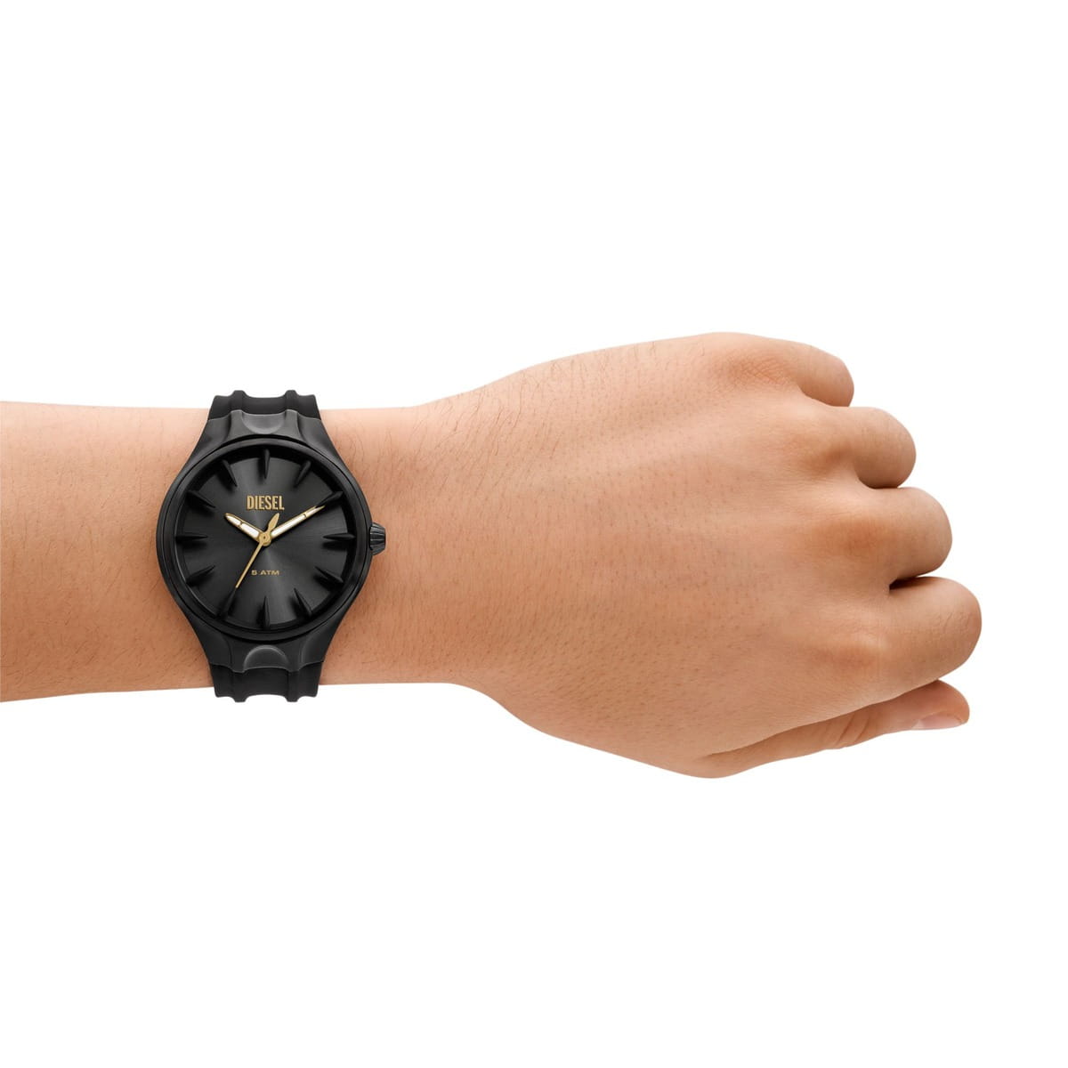 Дизайнерские часы Diesel Streamline DZ2217 представляют собой стильный аксессуар, который великолепно подчеркивает индивидуальность и вкус своего владельца. Они оснащены кварцевым механизмом, обеспечивающим высокую точность хода. Круглый корпус выполнен из нержавеющей стали с сочетанием матовых и полированных деталей, дополненных черным PVDPVDУльтратонкое покрытие наносится в технике вакуумного напыления, сочетает в себе нитрид титана особой прочности со слоем золота или оксида хрома. Несёт в себе декоративную или защитную функцию. покрытием, что придает часам современный и элегантный вид. Черный циферблат, украшенный логотипом бренда, изготовлен по технологии Sunray, создающей эффект солнечных лучей, и надежно защищен минеральным стекломМинеральное стеклоМинеральное стекло представляет собой искусственно выращенный минерал кварца. Такое стекло отличается особой устойчивостью к повреждениям и царапинам. Уступает по некоторым качествам сапфировому стеклу.. Метки на циферблате выполнены в виде штрихов, что добавляет изысканности дизайну. Рифленая заводная головка обеспечивает удобство в настройке времени. Для комфортного ношения предусмотрен силиконовый ремешок с классической застежкой. Часы обладают классом водозащиты 5 бар (50 метров), что позволяет не беспокоиться о попадании воды при мытье рук или прогулке под дождем. Стрелки с люминесцентным покрытиемЛюминесцентное покрытиеПозволяет считывать показания времени в темноте. Производители наносят на стрелки, часовые индексы, безель или поверхность циферблата светонакопительный состав, дающий холодное свечение. обеспечивают удобное считывание времени в темноте после кратковременного пребывания на свету, что делает эти часы практичными в любых условиях.