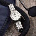 Модель выполнена в минималистичном дизайне, дополненным спортивными элементами. Белый циферблат имеет крупные часовые индексы и стрелки, для удобства считывания показателей они отличаются контрастным оттенком. Часы сделаны из хирургической стали 316L, материал устойчив к царапинам и коррозии. Кварцевый механизм японского производства с точностью хода +/- 20 секунд в месяц. Срок службы батарейки - 3 года. Яркая подсветка NeobriteПодсветка NeobriteИспользование светонакопительных составов на основе сульфида цинка или алюмината стронция, яркий свет можно наблюдать на протяжении 6-10 часов после «зарядки» часов около источника света.. Сохранение водонепроницаемости до 10 бар. Закручивающаяся задняя крышка. Заводная головка с системой защиты. Индикация текущего числа. Габариты: 37,8 x 42 x 9,4 мм.