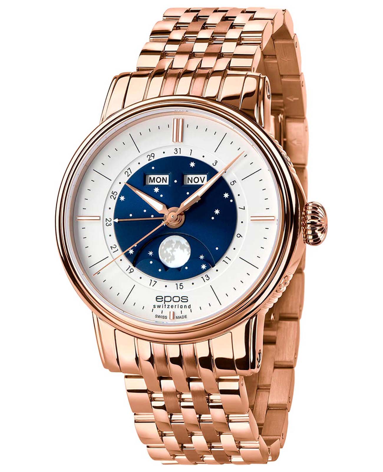 Мужские швейцарские механические часы с автоподзаводом Epos Oeuvre d'art 3439.322.24.26.34. Сапфировое стеклоСапфировое стеклоПрочный и надёжный материал из кристалла сапфира синтетического происхождения, характеризующийся особой твёрдостью и устойчивостью к царапинам и повреждениям. устойчивое к появлению царапин, обладающее высокой прозрачностью. Корпус и браслет часов изготовлен из нержавеющей стали с PVD-покрытиемPVDУльтратонкое покрытие наносится в технике вакуумного напыления, сочетает в себе нитрид титана особой прочности со слоем золота или оксида хрома. Несёт в себе декоративную или защитную функцию.. В механизме 25 камней, частота 28800 полуколебаний в час. Запас хода 42 часа. Механизм декорирован узором Cotes de Geneve. Циферблат выполнен по технологии Sunray (солнечные лучи). В центре циферблат дополнен изображением ночного неба со светящимися звездами и большой светящейся луной луна с люминесцентной подсветкойЛюминесцентное покрытиеПозволяет считывать показания времени в темноте. Производители наносят на стрелки, часовые индексы, безель или поверхность циферблата светонакопительный состав, дающий холодное свечение.. Накладные метки в виде штрихов. Дата отображается центральной стрелкой. Окошко дня недели и месяца. Автоматический указатель фазы луны. Винтажная заводная головка. Прозрачная задняя крышка. Класс водозащиты: 50 метров, позволит защитить корпус от случайных брызг или капель дождя. Стальной браслет на раскладной застёжкеРаскладная застёжкаТакой тип застёжки используется только на браслетах из металла. Она никогда не раскрывается полностью, происходит разделение на 2 и более частей. Раскладывающая застёжка снизит вероятность потери часов к минимуму..