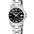 Женские кварцевые часы Festina F20049/6 из коллекции Swiss Made — это элегантный аксессуар, сочетающий швейцарское качество и классический стиль. Корпус диаметром 30 мм выполнен из нержавеющей стали серебряного цвета. Циферблат чёрного цвета дополнен окошком даты в положении 3 часов. Циферблат защищён сапфировым стекломСапфировое стеклоПрочный и надёжный материал из кристалла сапфира синтетического происхождения, характеризующийся особой твёрдостью и устойчивостью к царапинам и повреждениям.. Стрелки и метки с люминесцентным покрытиемЛюминесцентное покрытиеПозволяет считывать показания времени в темноте. Производители наносят на стрелки, часовые индексы, безель или поверхность циферблата светонакопительный состав, дающий холодное свечение., обеспечивающим хорошую читаемость в темноте. Заводная головка — вытягивающегося типа, задняя крышка — завинчивающаяся, что обеспечивает повышенную надёжность. Часы оснащены стальным браслетом на раскладной застёжкеРаскладная застёжкаТакой тип застёжки используется только на браслетах из металла. Она никогда не раскрывается полностью, происходит разделение на 2 и более частей. Раскладывающая застёжка снизит вероятность потери часов к минимуму. с кнопками. Механизм — швейцарский кварцевый калибр Ronda 785 с 42-месячным сроком службы батареи. Водонепроницаемость 100 м позволяет использовать часы для плавания. Идеальный выбор для тех, кто ценит точность, стиль и швейцарское мастерство.