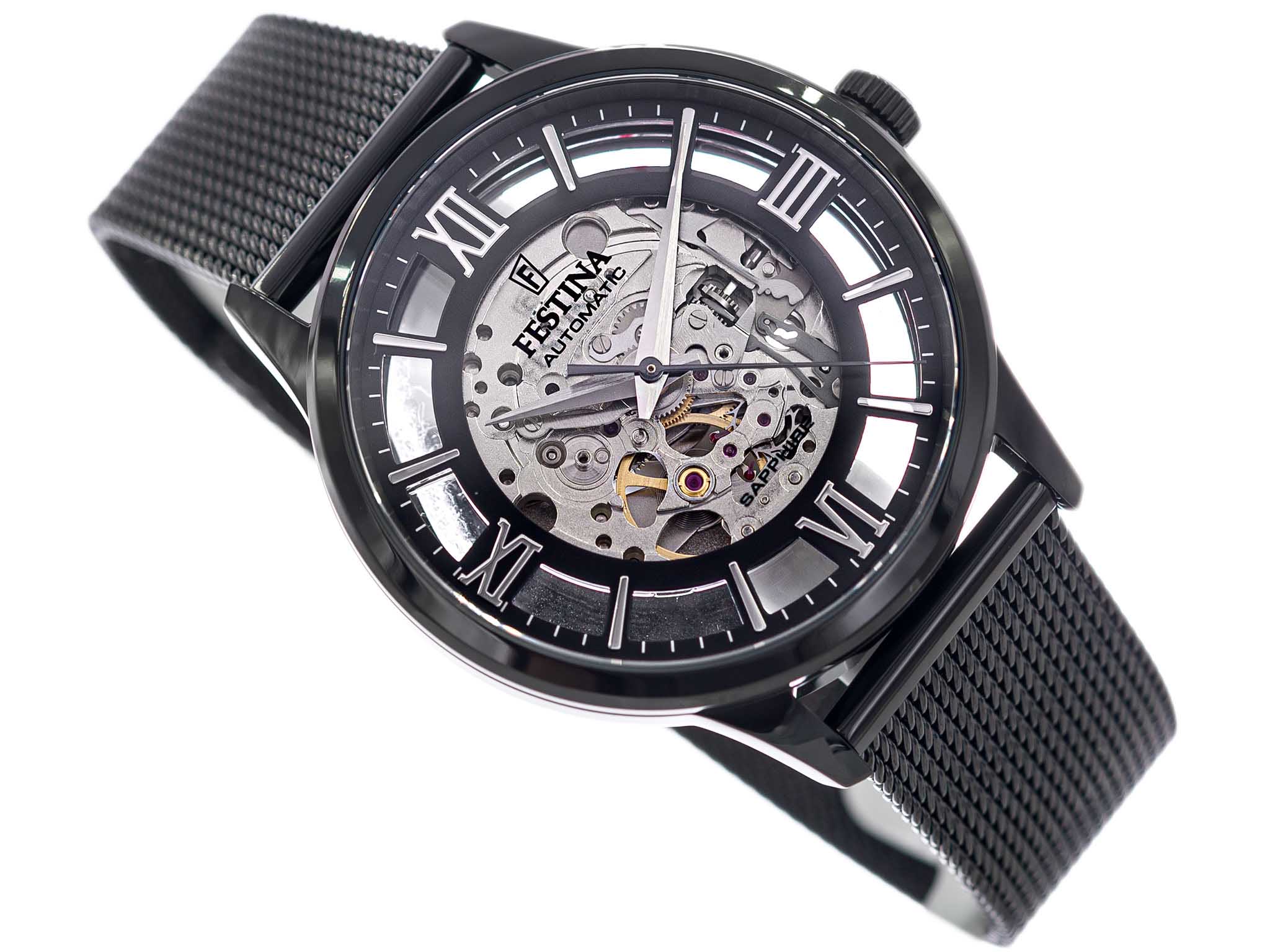 Мужские механические часы-скелетоны Festina Automatic F20535/1, механический механизм (автоматический калибр) с высокой точностью. Сапфировое стеклоСапфировое стеклоПрочный и надёжный материал из кристалла сапфира синтетического происхождения, характеризующийся особой твёрдостью и устойчивостью к царапинам и повреждениям. устойчивое к появлению царапин, обладающее высокой прозрачностью. Класс водозащиты: 50 метров, позволит защитить корпус от случайных брызг или капель дождя. Корпус часов изготовлен из стали с PVD-покрытиемPVDУльтратонкое покрытие наносится в технике вакуумного напыления, сочетает в себе нитрид титана особой прочности со слоем золота или оксида хрома. Несёт в себе декоративную или защитную функцию.. Стальной браслет на раскладной застёжкеРаскладная застёжкаТакой тип застёжки используется только на браслетах из металла. Она никогда не раскрывается полностью, происходит разделение на 2 и более частей. Раскладывающая застёжка снизит вероятность потери часов к минимуму. с PVD-покрытиемPVDУльтратонкое покрытие наносится в технике вакуумного напыления, сочетает в себе нитрид титана особой прочности со слоем золота или оксида хрома. Несёт в себе декоративную или защитную функцию.. В механизме 21 камень. Циферблат с метками в виде штрихов и римских цифр. Рифленая заводная головка. Прозрачная задняя крышка. Браслет миланского плетения.