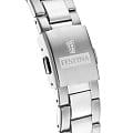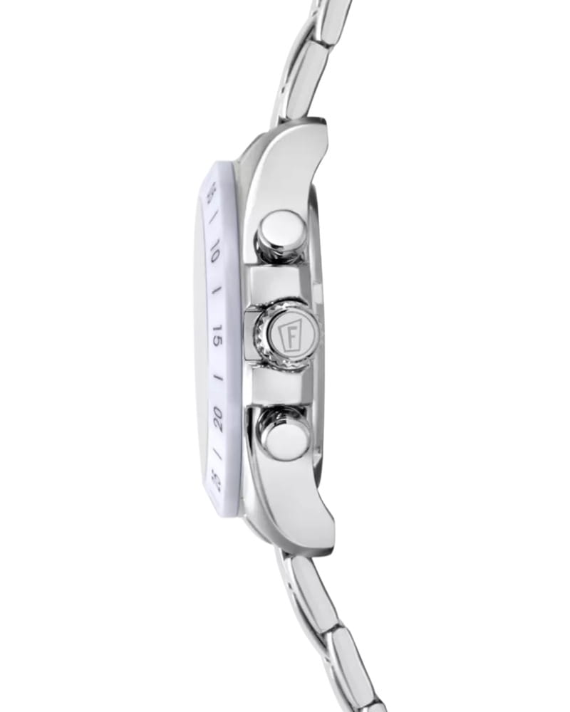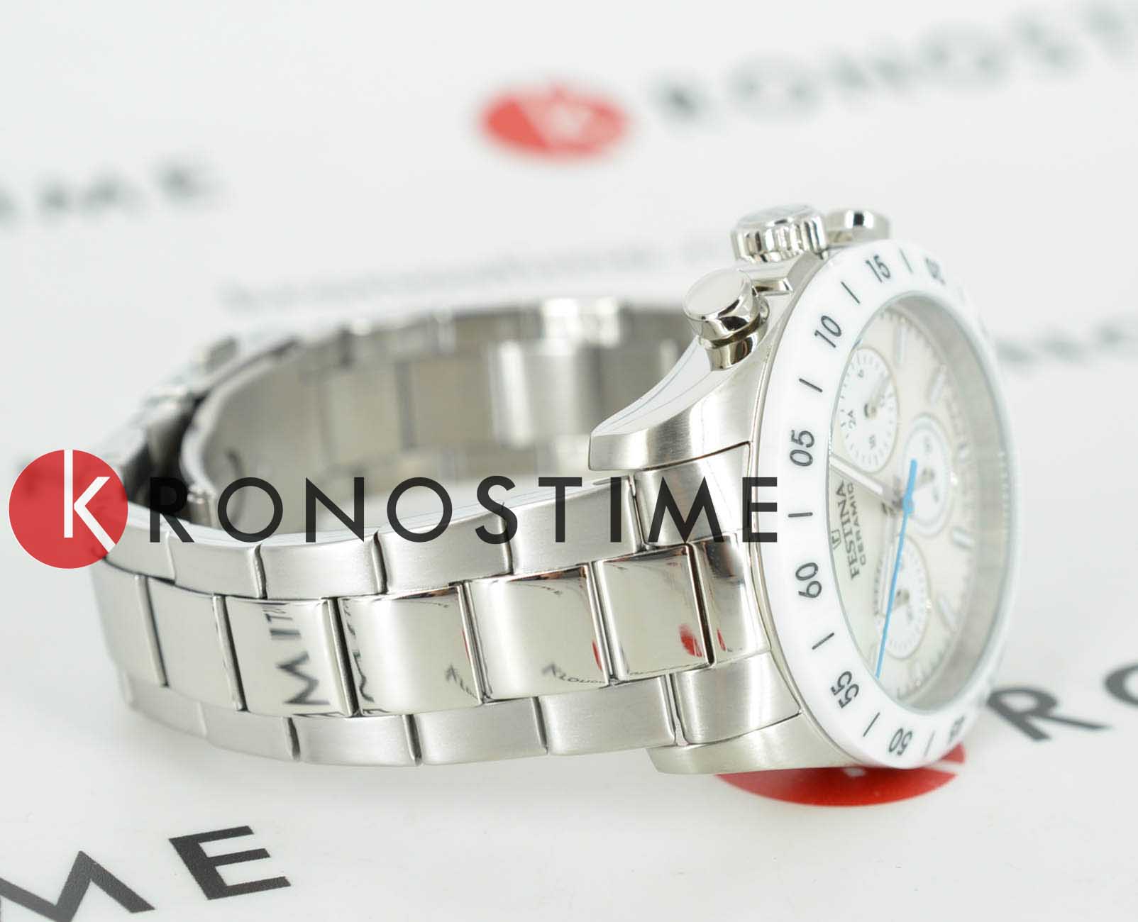Часы Festina Ceramic Chrono F20693/1 — элегантная модель хронографаХронографФункция позволяет измерять отрезки времени с особой точностью: часы, минуты, секунды. Верным признаком хронографа является наличие на циферблате 3 дополнительных окошек-счётчиков. с секундомеромСекундомерСекундоме́р — прибор, способный измерять интервалы времени с точностью до долей секунды., сочетающая стиль и функциональность. Корпус диаметром 39 мм выполнен из нержавеющей стали с керамическим безелемБезельВнешний ободок, закрепляющий стекло. В спортивных часах так называется поворотное кольцо с делениями на циферблате, выполняет роль таймера – замеряет отрезки времени на шкале. Неподвижный безель – элемент декора. Однонаправленно вращающийся безель на дайверских часах позволяет фиксировать моменты погружения и выныривания на поверхность. белого цвета. Перламутровый белый циферблат с хронографическими субциферблатами и индикатором даты защищён минеральным стекломМинеральное стеклоМинеральное стекло представляет собой искусственно выращенный минерал кварца. Такое стекло отличается особой устойчивостью к повреждениям и царапинам. Уступает по некоторым качествам сапфировому стеклу.. Модель оснащена кварцевым механизмом, обеспечивающим высокую точность хода. Водозащита до 100 метров позволяет использовать часы для плавания и сноркелинга. Браслет из нержавеющей стали с раскладной застёжкойРаскладная застёжкаТакой тип застёжки используется только на браслетах из металла. Она никогда не раскрывается полностью, происходит разделение на 2 и более частей. Раскладывающая застёжка снизит вероятность потери часов к минимуму. обеспечивает надёжную фиксацию и комфортное ношение. Стрелки и метки с люминесцентным покрытиемЛюминесцентное покрытиеПозволяет считывать показания времени в темноте. Производители наносят на стрелки, часовые индексы, безель или поверхность циферблата светонакопительный состав, дающий холодное свечение. обеспечивают удобное считывание времени в темноте после кратковременного пребывания на свету, что делает эти часы практичными в любых условиях. Эти часы подчёркивают изысканный вкус своей обладательницы, идеально подходя для повседневного ношения и особых случаев.
