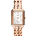 Женские американские часы с минеральным стекломМинеральное стеклоМинеральное стекло представляет собой искусственно выращенный минерал кварца. Такое стекло отличается особой устойчивостью к повреждениям и царапинам. Уступает по некоторым качествам сапфировому стеклу. Fossil Raquel ES5271, кварцевый механизм с высокой точностью. Корпус и браслет часов изготовлены из нержавеющей стали с IP-покрытиемIP-покрытиеМетод ионного напыления. Демонстрирует повышенную устойчивость к истиранию, окислению и химическим веществам. Под воздействием высокого давления и температуры около 1500°C молекулы металла надёжно соединяются с частицами корпуса часов.. Класс водозащиты: 50 метров, позволит защитить корпус от случайных брызг или капель дождя. Стальной браслет на раскладной застёжкеРаскладная застёжкаТакой тип застёжки используется только на браслетах из металла. Она никогда не раскрывается полностью, происходит разделение на 2 и более частей. Раскладывающая застёжка снизит вероятность потери часов к минимуму.. Окошко даты находится в положении 6 часов.