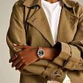 Часы Fossil ES5369 представляют собой изысканный аксессуар, который подчеркнет ваш стиль и индивидуальность. Эти женские наручные часы произведены в США и оснащены надежным кварцевым механизмом. Корпус выполнен из высококачественной стали с розово-золотистым IP-покрытиемIP-покрытиеМетод ионного напыления. Демонстрирует повышенную устойчивость к истиранию, окислению и химическим веществам. Под воздействием высокого давления и температуры около 1500°C молекулы металла надёжно соединяются с частицами корпуса часов., а рифленый безельБезельВнешний ободок, закрепляющий стекло. В спортивных часах так называется поворотное кольцо с делениями на циферблате, выполняет роль таймера – замеряет отрезки времени на шкале. Неподвижный безель – элемент декора. Однонаправленно вращающийся безель на дайверских часах позволяет фиксировать моменты погружения и выныривания на поверхность. с золотистым IP-покрытиемIP-покрытиеМетод ионного напыления. Демонстрирует повышенную устойчивость к истиранию, окислению и химическим веществам. Под воздействием высокого давления и температуры около 1500°C молекулы металла надёжно соединяются с частицами корпуса часов. придает часам элегантный и современный вид. Изумрудно-зеленый циферблат, изготовленный по технологии Sunray, украшен кристаллами, что придает ему особое сияние и элегантность. Метки в виде точек с кристаллами и римские цифры VI и XII создают утонченный и классический облик. В положении 3 часа находится окошко даты с увеличительным стеклом, что добавляет дополнительное удобство в повседневной жизни. Стрелки с люминесцентным покрытиемЛюминесцентное покрытиеПозволяет считывать показания времени в темноте. Производители наносят на стрелки, часовые индексы, безель или поверхность циферблата светонакопительный состав, дающий холодное свечение. позволяют легко считывать время даже в условиях низкой освещенности. Полированный стальной браслет с розово-золотистым IP-покрытиемIP-покрытиеМетод ионного напыления. Демонстрирует повышенную устойчивость к истиранию, окислению и химическим веществам. Под воздействием высокого давления и температуры около 1500°C молекулы металла надёжно соединяются с частицами корпуса часов. и раскладной застёжкойРаскладная застёжкаТакой тип застёжки используется только на браслетах из металла. Она никогда не раскрывается полностью, происходит разделение на 2 и более частей. Раскладывающая застёжка снизит вероятность потери часов к минимуму. обеспечивает комфортное ношение и надежную фиксацию на запястье. Водозащита 50WR позволяет не беспокоиться о случайных брызгах воды. Минеральное стеклоМинеральное стеклоМинеральное стекло представляет собой искусственно выращенный минерал кварца. Такое стекло отличается особой устойчивостью к повреждениям и царапинам. Уступает по некоторым качествам сапфировому стеклу. защищает циферблат от царапин и повреждений. С диаметром корпуса 32 мм и шириной браслета 16 мм, эти часы прекрасно подойдут для тех, кто ценит стиль и качество в каждой детали.