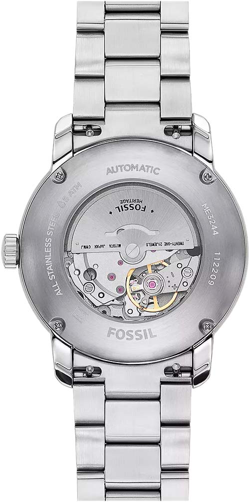 Наручные часы Fossil Heritage ME3244 с надёжным автоматическим механизмом. Корпус и браслет часов изготовлены из нержавеющей стали. Минеральное стеклоМинеральное стеклоМинеральное стекло представляет собой искусственно выращенный минерал кварца. Такое стекло отличается особой устойчивостью к повреждениям и царапинам. Уступает по некоторым качествам сапфировому стеклу. устойчивое к мелким механическим повреждениям. Стальной браслет на раскладной застёжкеРаскладная застёжкаТакой тип застёжки используется только на браслетах из металла. Она никогда не раскрывается полностью, происходит разделение на 2 и более частей. Раскладывающая застёжка снизит вероятность потери часов к минимуму.. Класс водозащиты: 50 метров, позволит защитить корпус от случайных брызг или капель дождя. Стрелки и метки с люминесцентным покрытиемЛюминесцентное покрытиеПозволяет считывать показания времени в темноте. Производители наносят на стрелки, часовые индексы, безель или поверхность циферблата светонакопительный состав, дающий холодное свечение.. Окошко даты находится в положении 3 часа.