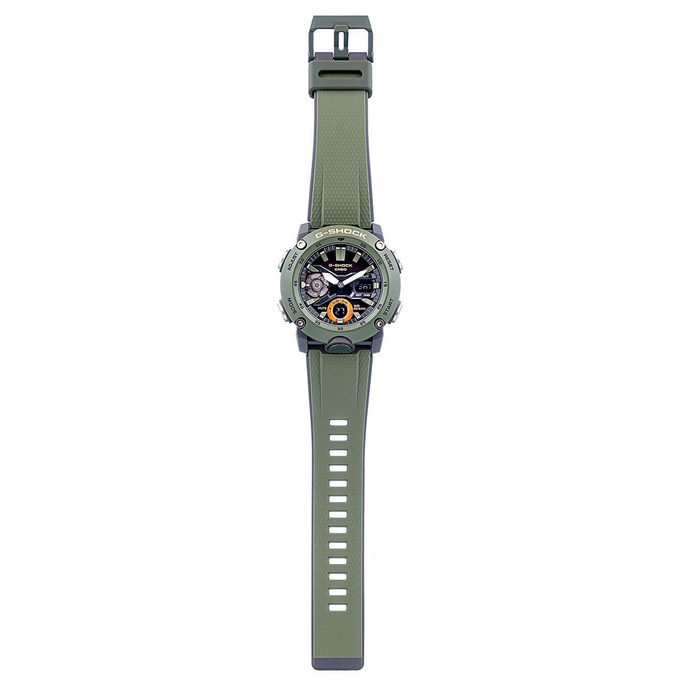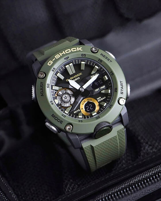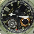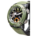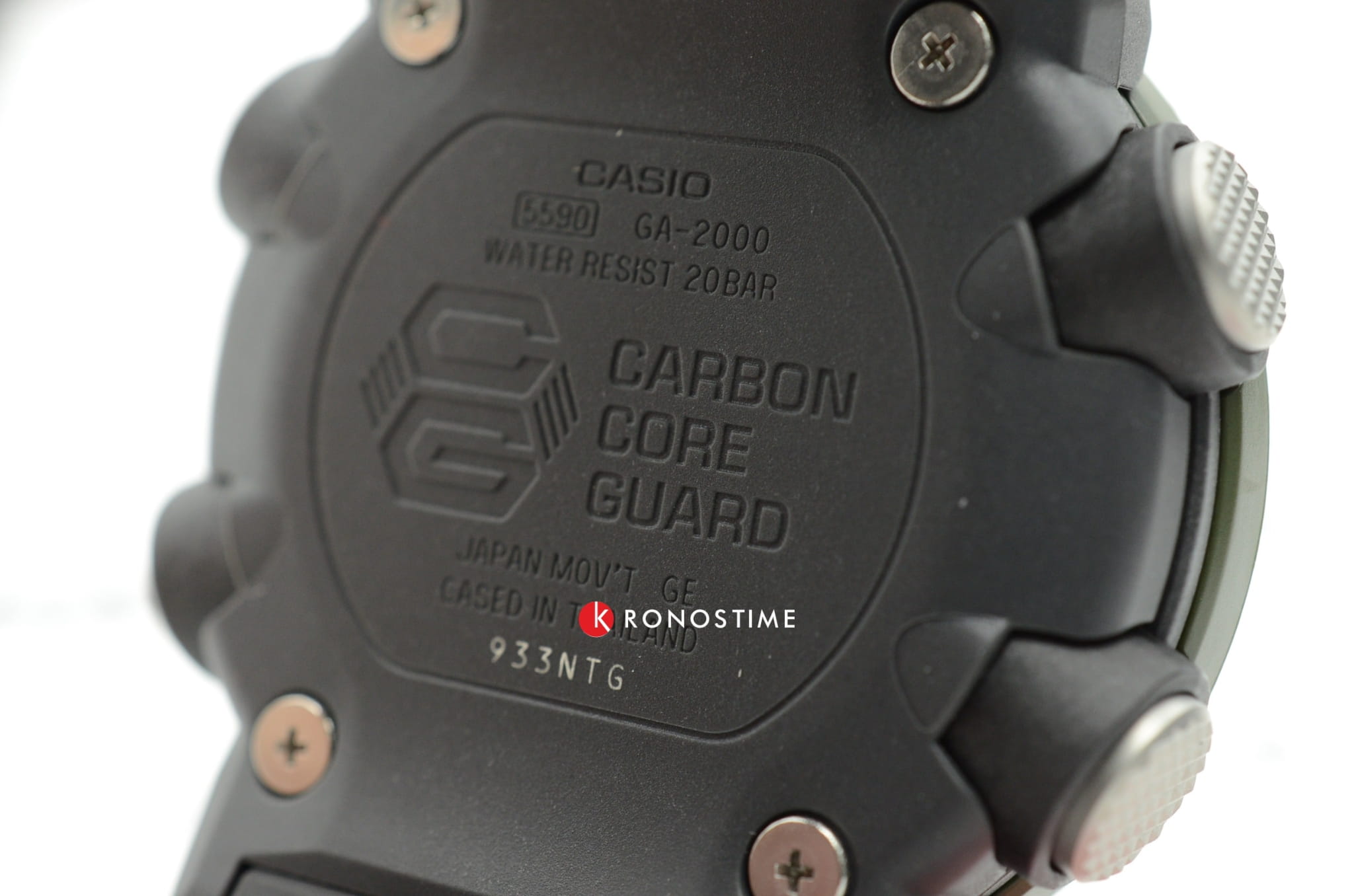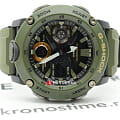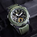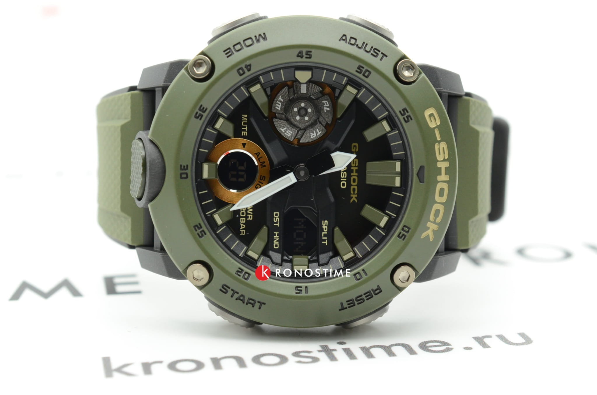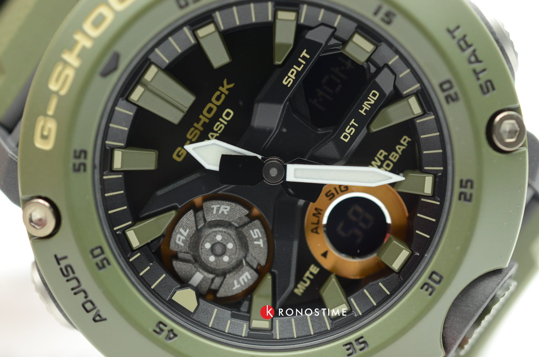 Наручные часы тёмно-зелёного "защитного" оттенка отличаются броским внешним видом, они стильно смотрятся на широком запястье. Индикатор режима работы часов сделан в виде пропеллера. Новая модель GA-2000 реализует технологию Carbon Core GuardCarbon Core Guard Новейшая структура корпуса, разработанная Casio. Полиуретановая пластина дополнительно усилена карбоновыми вставками, что придаёт специальную защиту от механических повреждений. Карбон отличается лёгкостью и прочностью., полимер имеет включения из углеродного волокна. Батарейка рассчитана на 2 года. Двойная задняя крышка: первая из стали 316L для защиты кварцевого механизма, вторая из пластика. Минеральное стекло. Надёжный ремешок из полимерного материала. Яркая светодиодная подсветкаСветодиодная подсветкаСветодиодная или LED-подсветка обеспечивает появление яркого холодного свечения за счёт LED-элементов - маленьких лампочек. Они потребляют минимальное количество энергии, чаще всего можно встретить 1 светодиод, в нижней части циферблата. циферблата и дисплеев. Водонепроницаемость 200 метров. Секундомер, хронографХронографФункция позволяет измерять отрезки времени с особой точностью: часы, минуты, секунды. Верным признаком хронографа является наличие на циферблате 3 дополнительных окошек-счётчиков., автоматический календарь, мировое времяМировое время Полезное часовое усложнение, отображающее время в основных городах и известных областях по всему миру, оно связано с часовыми поясами, удобно для путешественников и бизнесменов. , будильник. Габариты: 48,7 x 51,2 x 14,1 мм.