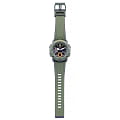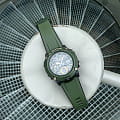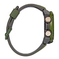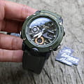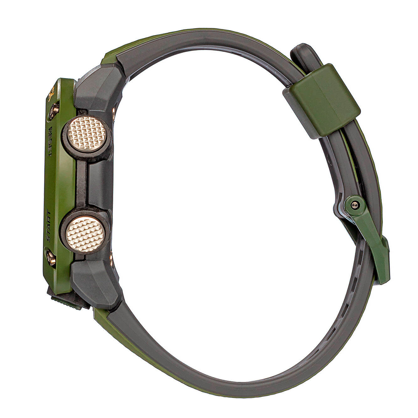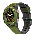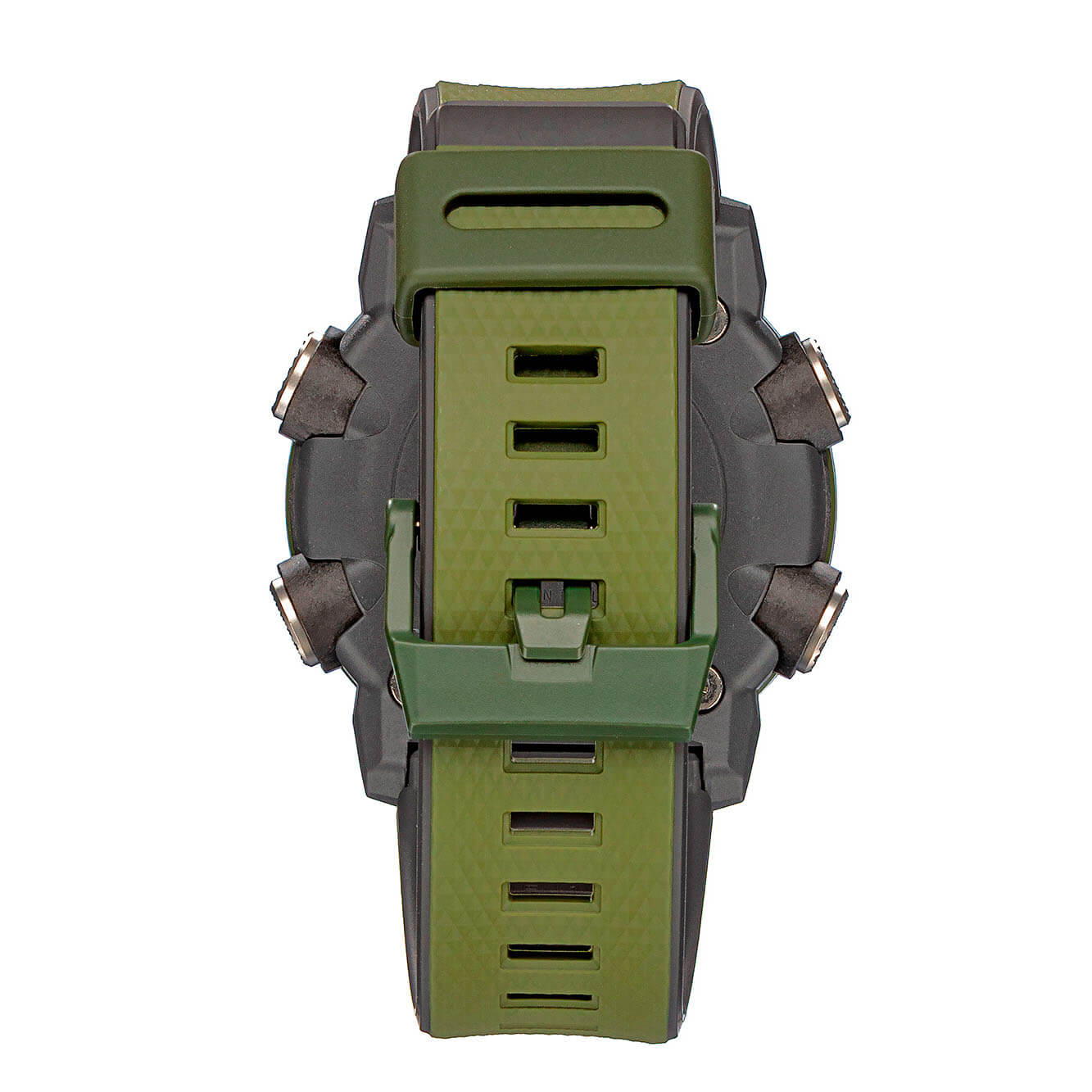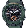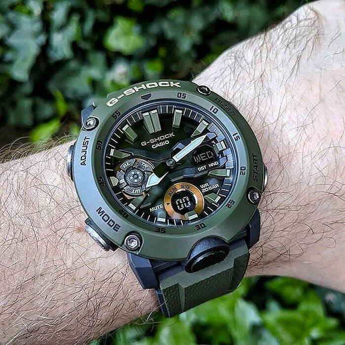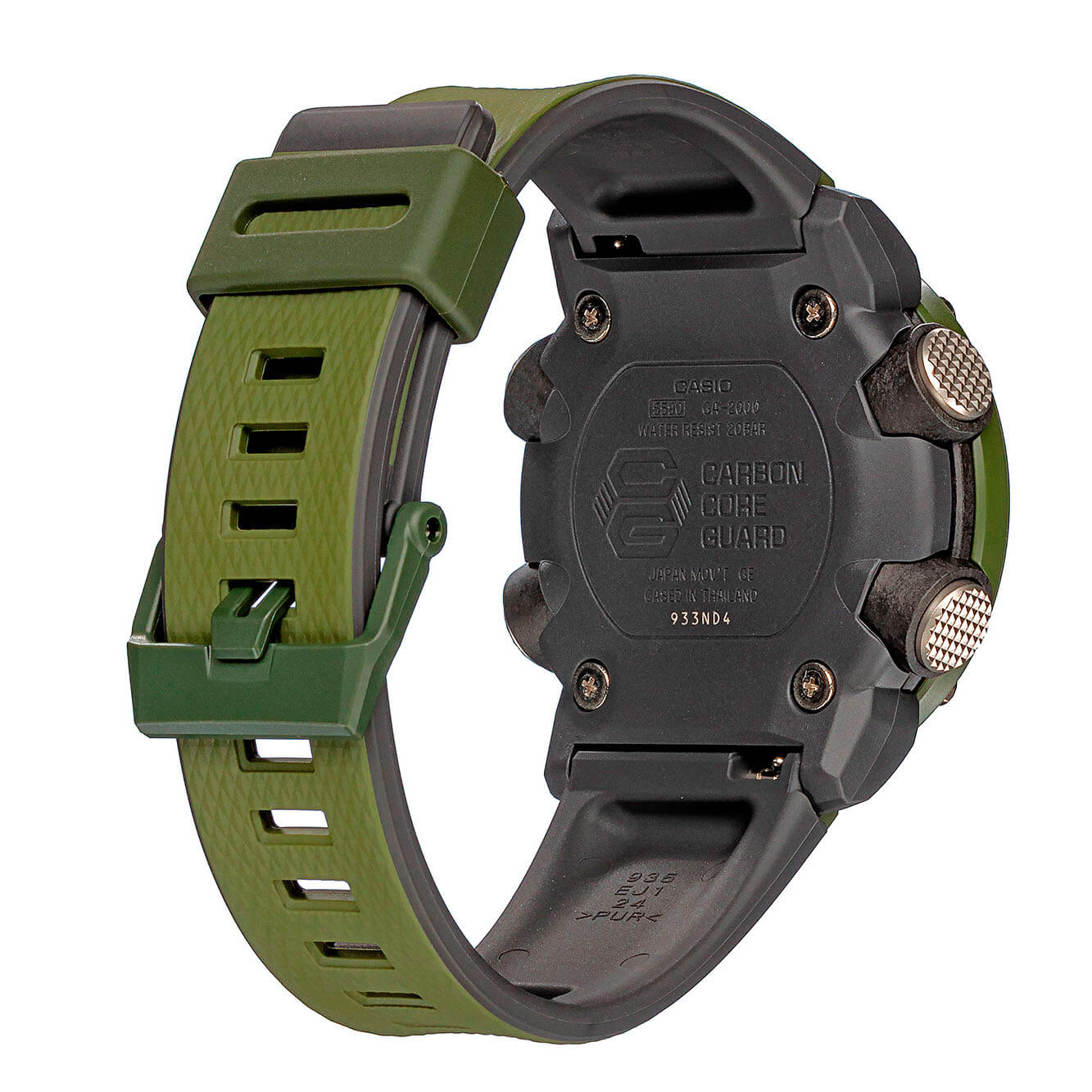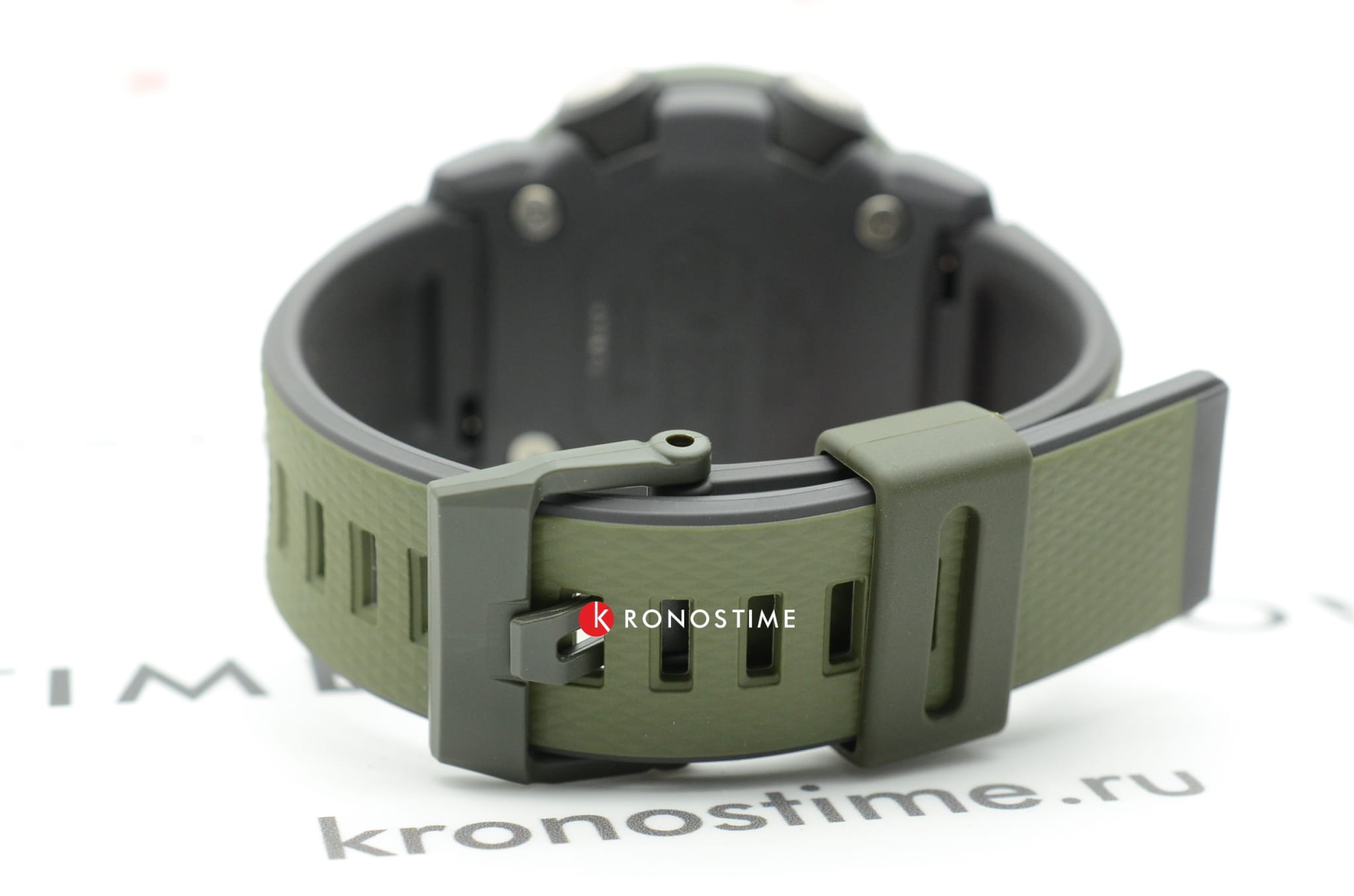 Наручные часы тёмно-зелёного "защитного" оттенка отличаются броским внешним видом, они стильно смотрятся на широком запястье. Индикатор режима работы часов сделан в виде пропеллера. Новая модель GA-2000 реализует технологию Carbon Core GuardCarbon Core Guard Новейшая структура корпуса, разработанная Casio. Полиуретановая пластина дополнительно усилена карбоновыми вставками, что придаёт специальную защиту от механических повреждений. Карбон отличается лёгкостью и прочностью., полимер имеет включения из углеродного волокна. Батарейка рассчитана на 2 года. Двойная задняя крышка: первая из стали 316L для защиты кварцевого механизма, вторая из пластика. Минеральное стекло. Надёжный ремешок из полимерного материала. Яркая светодиодная подсветкаСветодиодная подсветкаСветодиодная или LED-подсветка обеспечивает появление яркого холодного свечения за счёт LED-элементов - маленьких лампочек. Они потребляют минимальное количество энергии, чаще всего можно встретить 1 светодиод, в нижней части циферблата. циферблата и дисплеев. Водонепроницаемость 200 метров. Секундомер, хронографХронографФункция позволяет измерять отрезки времени с особой точностью: часы, минуты, секунды. Верным признаком хронографа является наличие на циферблате 3 дополнительных окошек-счётчиков., автоматический календарь, мировое времяМировое время Полезное часовое усложнение, отображающее время в основных городах и известных областях по всему миру, оно связано с часовыми поясами, удобно для путешественников и бизнесменов. , будильник. Габариты: 48,7 x 51,2 x 14,1 мм.