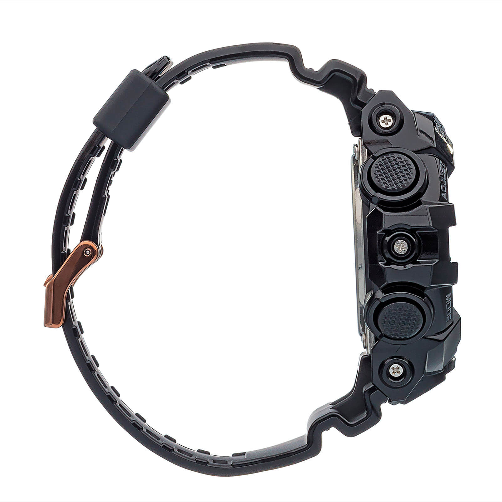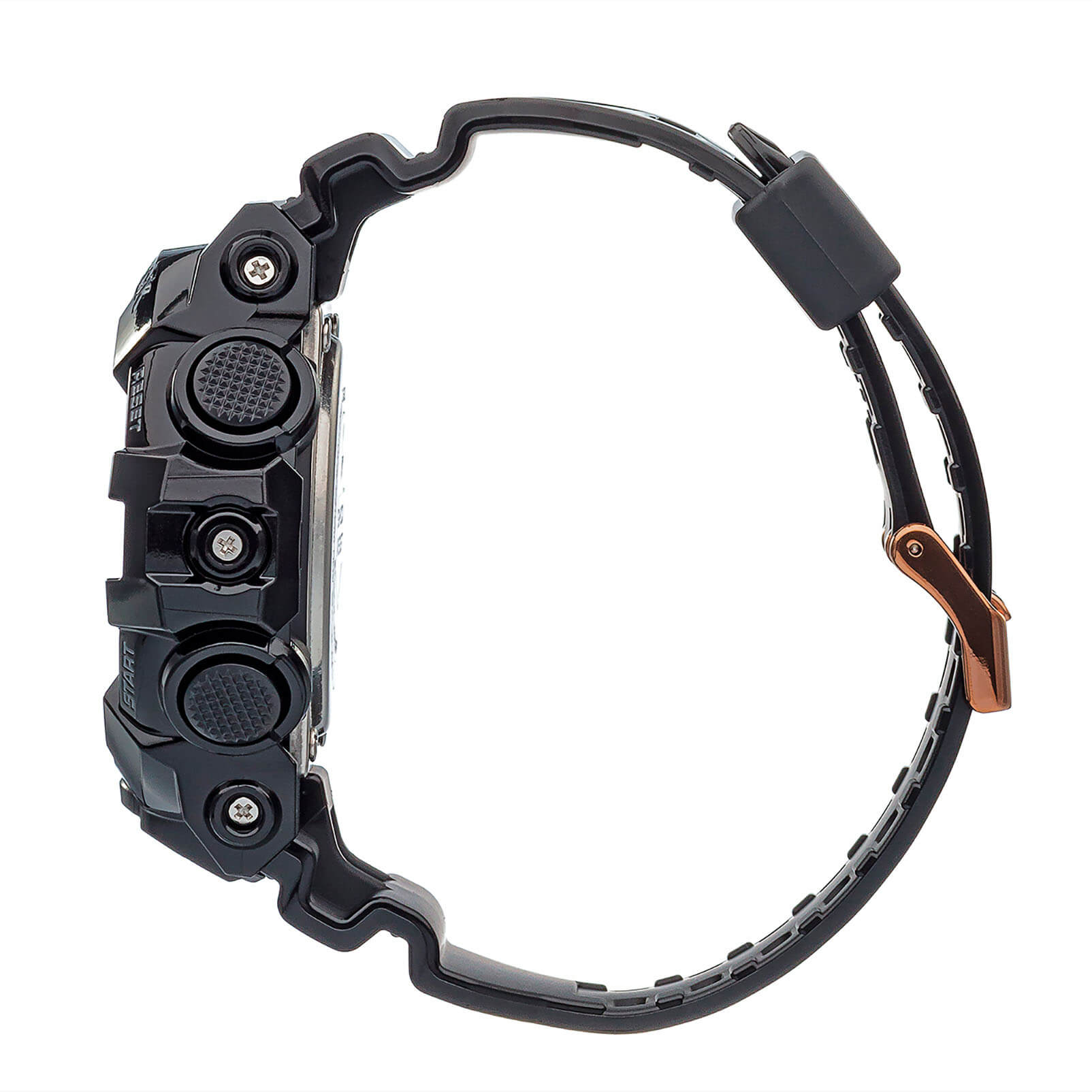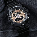Массивный металлизированный циферблат розово-золотистого цвета с крупной индикацией времени отлично смотрится на мужском запястье, такие часы станут интересной деталью образа. Практичная и функциональная модель в чёрном цвете имеет полимерный ударопрочный корпусУдаропрочный корпусМеханизм заключён в корпус, выполненный из современных материалов, устойчивых к ударам, механическим повреждениям и падению с высоты: инновационный пластик, карбон, нержавеющая сталь, титан., которому не страшны повреждения и падения с высоты. Высокоточный кварцевый механизм японского производства. Эксплуатационный срок батарейки - 5 лет. Яркая автоматическая светодиодная подсветкаСветодиодная подсветкаСветодиодная или LED-подсветка обеспечивает появление яркого холодного свечения за счёт LED-элементов - маленьких лампочек. Они потребляют минимальное количество энергии, чаще всего можно встретить 1 светодиод, в нижней части циферблата. белого цвета. Минеральное стекло. Водонепроницаемость 200 метров. 12/24-часовая система отображения времени. Прочный пластиковый ремешок. ХронографХронографФункция позволяет измерять отрезки времени с особой точностью: часы, минуты, секунды. Верным признаком хронографа является наличие на циферблате 3 дополнительных окошек-счётчиков., секундомер, таймер, мировое времяМировое время Полезное часовое усложнение, отображающее время в основных городах и известных областях по всему миру, оно связано с часовыми поясами, удобно для путешественников и бизнесменов. , 5 будильников, UTCUTCВсемирное кординационное время, не имеющее привязки к географическому положению Гринвича, основывается на атомном отсчёте времени. Регулировка времени осуществляется более точно, чем устаревшее GMT.