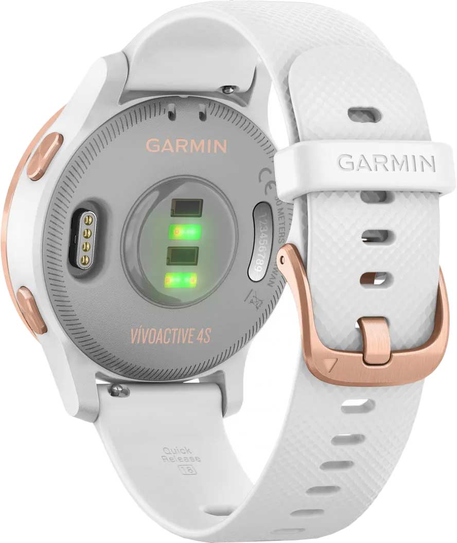 Умные многофункциональные женские часы Garmin Vivoactive 4S 010-02172-23, электронный механизм с высокой точностью. Класс водозащиты: 50 метров, позволит защитить корпус от случайных брызг или капель дождя. Корпус часов изготовлен из стали, разноцветного цвета.