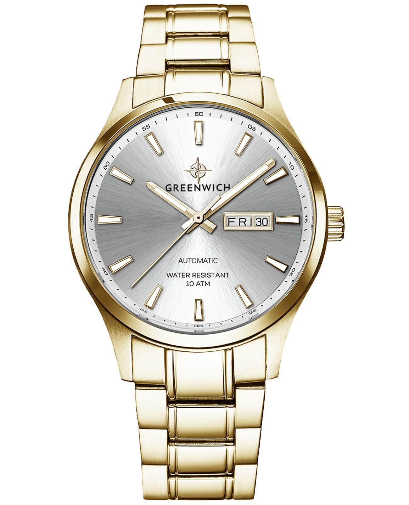 Мужские часы Greenwich Good Luck GW 054.20.33, механический механизм (автоматический калибр) с высокой точностью. Классический круглый стальной корпус с PVD-покрытиемPVDУльтратонкое покрытие наносится в технике вакуумного напыления, сочетает в себе нитрид титана особой прочности со слоем золота или оксида хрома. Несёт в себе декоративную или защитную функцию., защищенный минеральным стекломМинеральное стеклоМинеральное стекло представляет собой искусственно выращенный минерал кварца. Такое стекло отличается особой устойчивостью к повреждениям и царапинам. Уступает по некоторым качествам сапфировому стеклу.. Стрелки и метки с люминесцентным покрытиемЛюминесцентное покрытиеПозволяет считывать показания времени в темноте. Производители наносят на стрелки, часовые индексы, безель или поверхность циферблата светонакопительный состав, дающий холодное свечение.. Стальной браслет на раскладной застёжкеРаскладная застёжкаТакой тип застёжки используется только на браслетах из металла. Она никогда не раскрывается полностью, происходит разделение на 2 и более частей. Раскладывающая застёжка снизит вероятность потери часов к минимуму.. Класс водозащиты: 100 метров, позволит плавать, нырять и заниматься другими водными видами спорта. Окошко даты и дня недели находится в положении 3 часа.