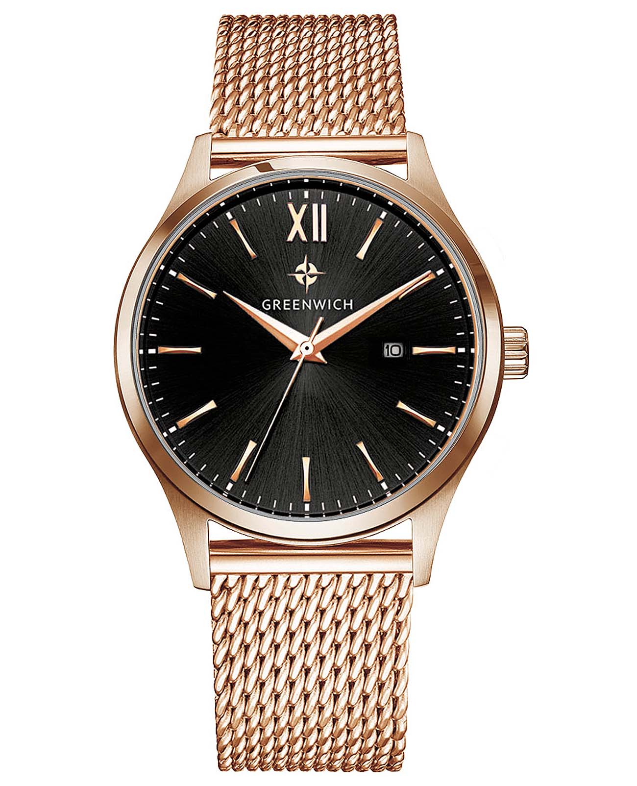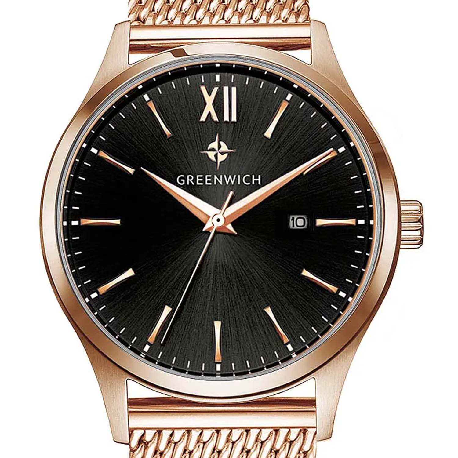 Мужские английские часы Greenwich GW 061.49.11 с минеральным стекломМинеральное стеклоМинеральное стекло представляет собой искусственно выращенный минерал кварца. Такое стекло отличается особой устойчивостью к повреждениям и царапинам. Уступает по некоторым качествам сапфировому стеклу.. Классические мужские часы серии Brig прекрасно подойдут как под костюм, так и под одежду направления casual. В часах установлен точный японский механизм Miyota. Корпус часов изготовлен из нержавеющей гипоаллергенной стали с PVDPVDУльтратонкое покрытие наносится в технике вакуумного напыления, сочетает в себе нитрид титана особой прочности со слоем золота или оксида хрома. Несёт в себе декоративную или защитную функцию. покрытием из розового золота: он изящно смотрится на руке и не создает неудобств при контакте с одеждой с длинным рукавом. Размер корпуса 41 мм. Полировка на циферблате черного цвета выполнена в виде солнечных лучей. Индексы часов изготовлены вручную и закреплены на двух штифтах. Выпуклая форма рисок создает эффект игры солнечных бликов. Объемные часовая и минутная стрелки имеют мечеобразную форму. В модели представлена дополнительная функция – дата. Ее окошко расположено на уровне трех часов. Циферблат надежно защищен минеральным стеклом. На часах установлен стальной браслет миланского плетения. Логотип марки – изображение «розы ветров», символа удачи и новых открытий – расположен на циферблате, заводной головке и внутренней части ремешка. Задняя крышка часов украшена изображениями логотипа и корабля, который является символом марки Greenwich.