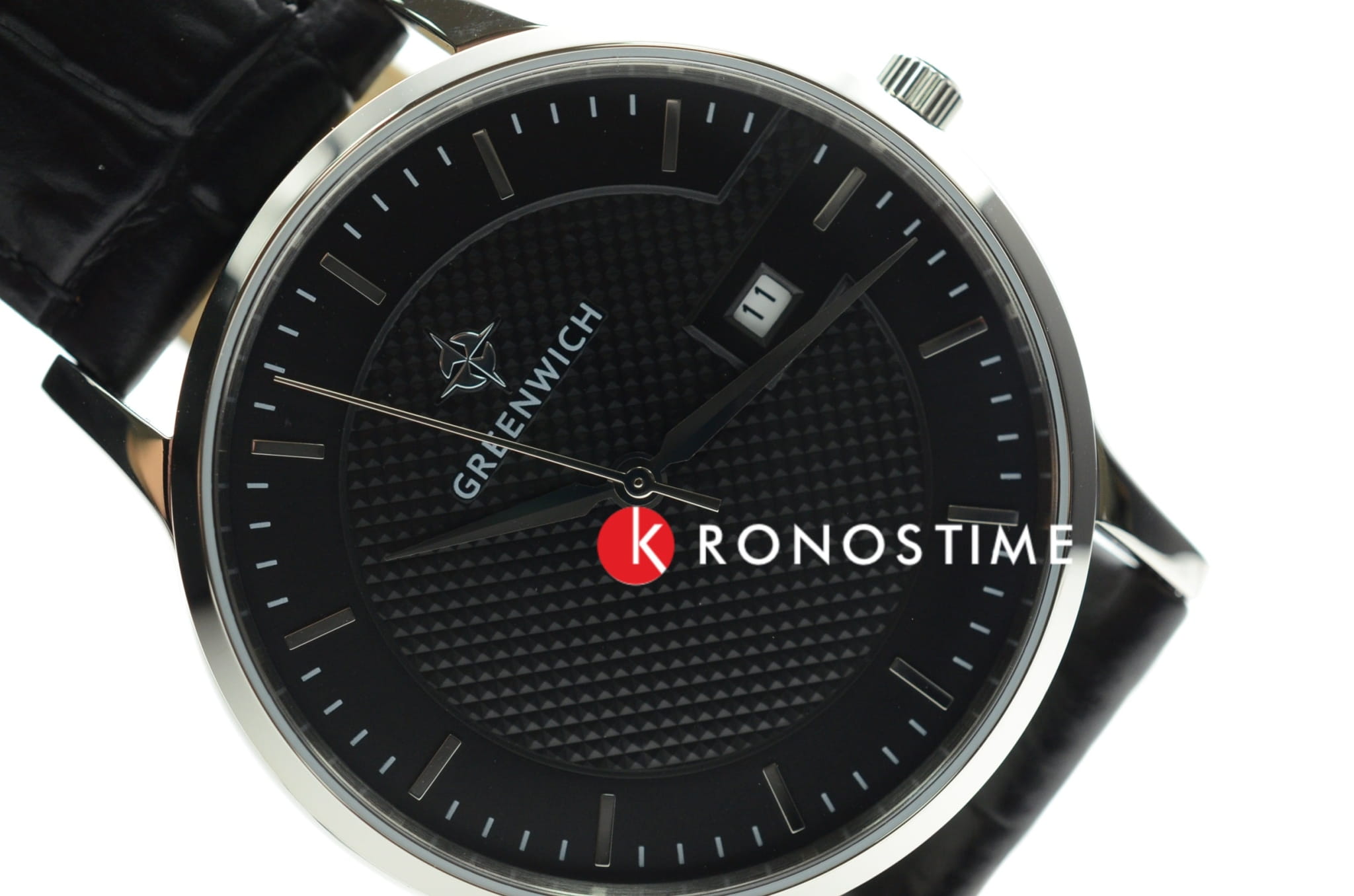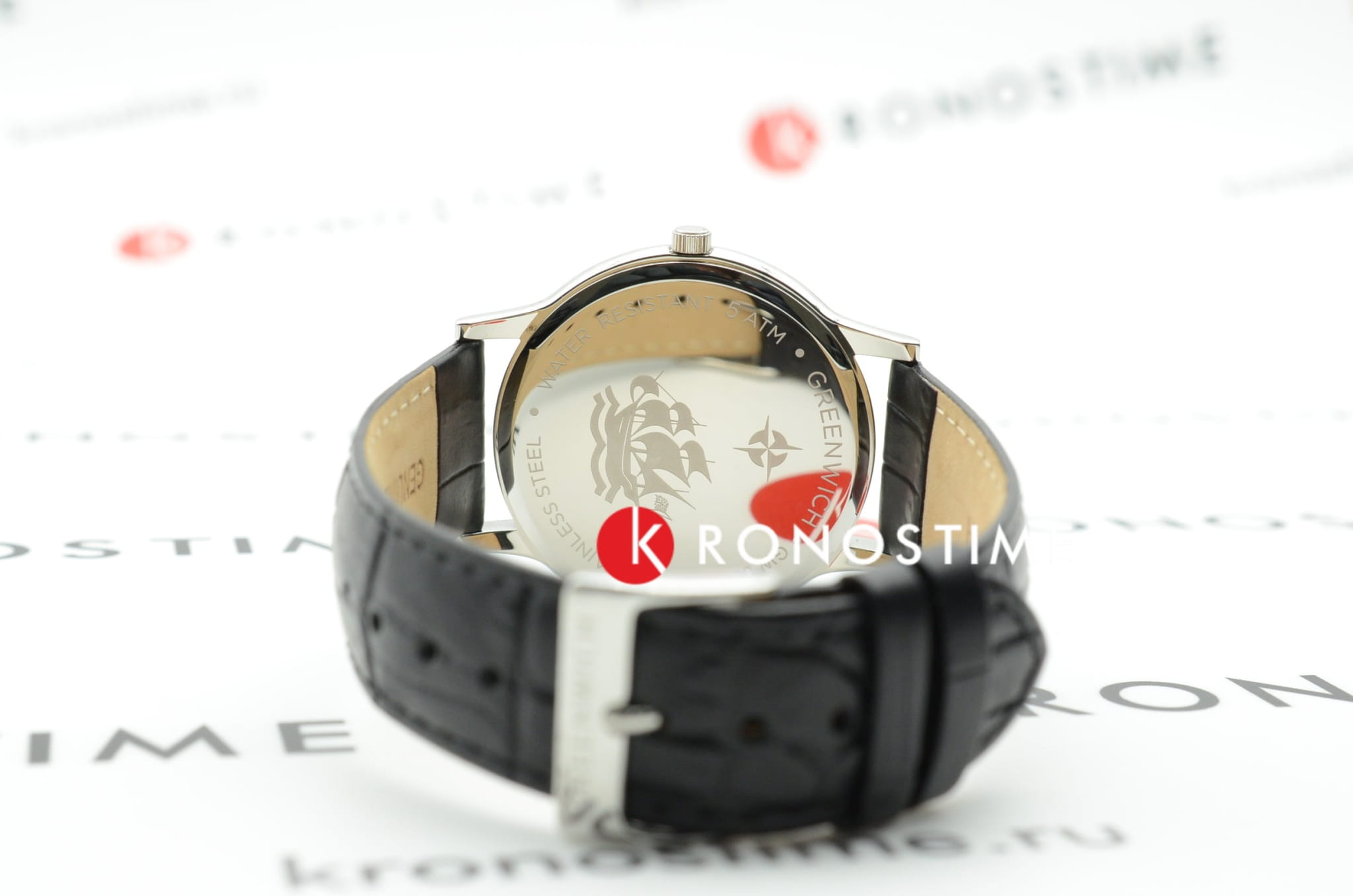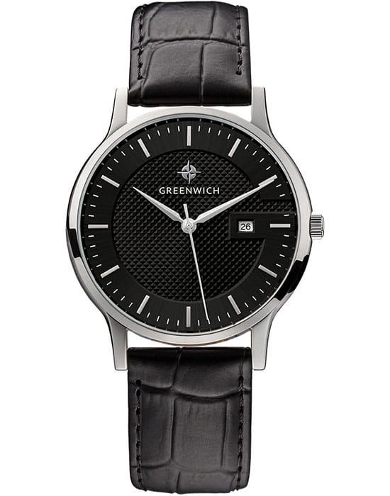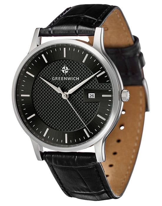 Часы классические , на кожаном черном ремешке. Циферблат выглядит объемным из-за того, что часть выполнена в технике гильоше. В модели представлена дополнительная функция – дата. Циферблат надежно защищен минеральным стеклом. Задняя крышка часов украшена изображениями «розы ветров» и корабля, который является символом марки Greenwich.