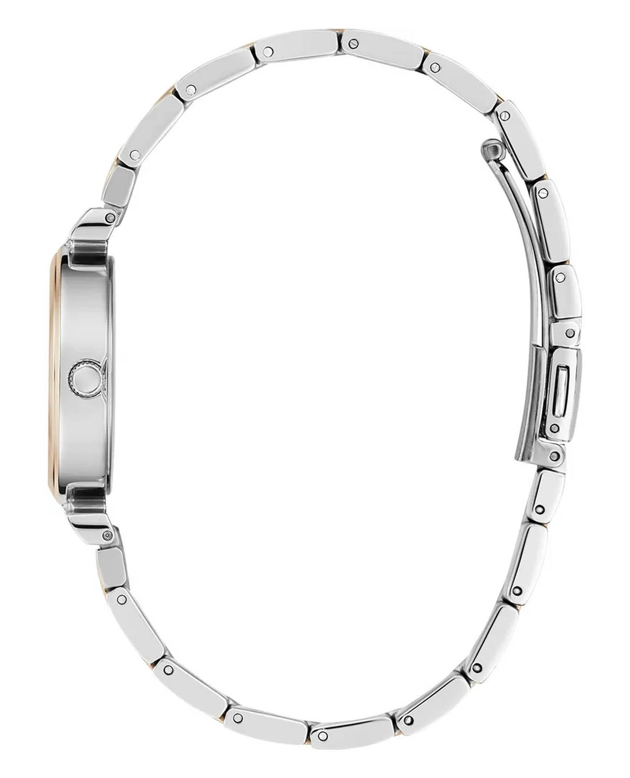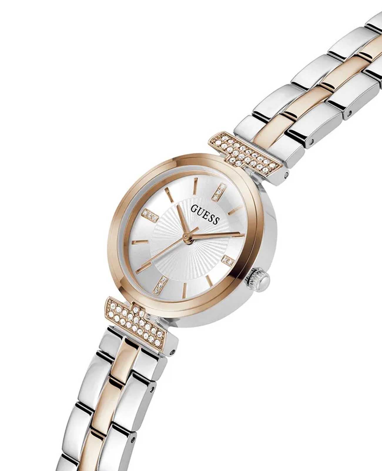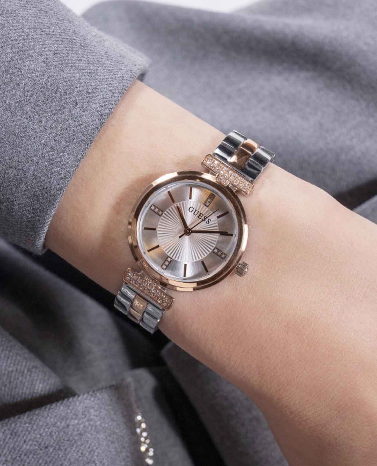 =Женские наручные часы Guess Dress GW0762L4 с минеральным стекломМинеральное стеклоМинеральное стекло представляет собой искусственно выращенный минерал кварца. Такое стекло отличается особой устойчивостью к повреждениям и царапинам. Уступает по некоторым качествам сапфировому стеклу., кварцевый механизм с высокой точностью. Корпус часов изготовлен из стали с частичным IP-покрытиемIP-покрытиеМетод ионного напыления. Демонстрирует повышенную устойчивость к истиранию, окислению и химическим веществам. Под воздействием высокого давления и температуры около 1500°C молекулы металла надёжно соединяются с частицами корпуса часов.. Корпус и циферблат украшены кристаллами. Класс водозащиты: 30 метров, позволит защитить корпус от случайных брызг или капель дождя. Стальной браслет с частичным IP-покрытиемIP-покрытиеМетод ионного напыления. Демонстрирует повышенную устойчивость к истиранию, окислению и химическим веществам. Под воздействием высокого давления и температуры около 1500°C молекулы металла надёжно соединяются с частицами корпуса часов. на раскладной застёжкеРаскладная застёжкаТакой тип застёжки используется только на браслетах из металла. Она никогда не раскрывается полностью, происходит разделение на 2 и более частей. Раскладывающая застёжка снизит вероятность потери часов к минимуму..