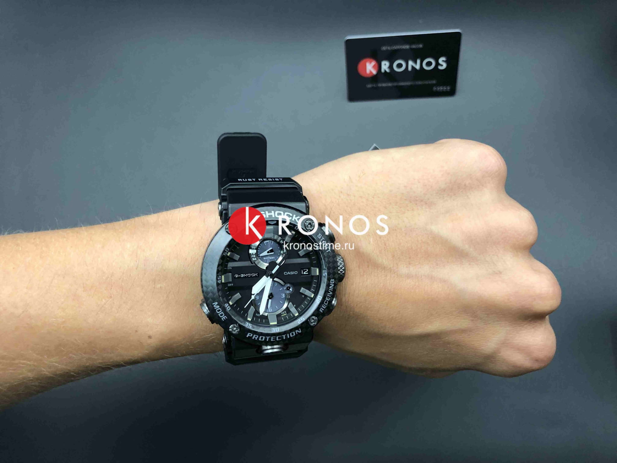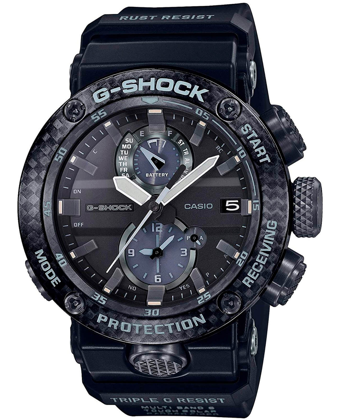 Внушительный аксессуар стильно смотрится на широком запястье, гармонично смотрятся крупные детали и общее тёмное исполнение. Задняя крышка здесь отсутствует, ударопрочный корпусУдаропрочный корпусМеханизм заключён в корпус, выполненный из современных материалов, устойчивых к ударам, механическим повреждениям и падению с высоты: инновационный пластик, карбон, нержавеющая сталь, титан. сделан из монолитного углеродного монокока, вдохновлённого конструкцией ранних самолётов. Он состоит из 52 карбоновых слоёв, уникальная текстура просматривается на боковых частях безеляБезельВнешний ободок, закрепляющий стекло. В спортивных часах так называется поворотное кольцо с делениями на циферблате, выполняет роль таймера – замеряет отрезки времени на шкале. Неподвижный безель – элемент декора. Однонаправленно вращающийся безель на дайверских часах позволяет фиксировать моменты погружения и выныривания на поверхность. – с успехом реализована технология Carbon Core GuardCarbon Core Guard Новейшая структура корпуса, разработанная Casio. Полиуретановая пластина дополнительно усилена карбоновыми вставками, что придаёт специальную защиту от механических повреждений. Карбон отличается лёгкостью и прочностью.. Полимерный ремешок тоже имеет усиление карбоновыми волокнами. Наручные часы обладают полезным функционалом: BluetoothBluetoothСовременная технология, позволяющая синхронизировать часы с телефоном и переносить данные. Часы с Bluetooth расширяют возможности вашего смартфона и делают его использование ещё более удобным., будильник, мировое времяМировое время Полезное часовое усложнение, отображающее время в основных городах и известных областях по всему миру, оно связано с часовыми поясами, удобно для путешественников и бизнесменов. , таймер, приём радиосигнала, питание от солнечной батареи . Сапфировое стекло с антибликовой обработкой. Яркая люминесцентная подсветкаЛюминесцентное покрытиеПозволяет считывать показания времени в темноте. Производители наносят на стрелки, часовые индексы, безель или поверхность циферблата светонакопительный состав, дающий холодное свечение.. Габариты: 50,1 x 46,4 x 16,9 мм.