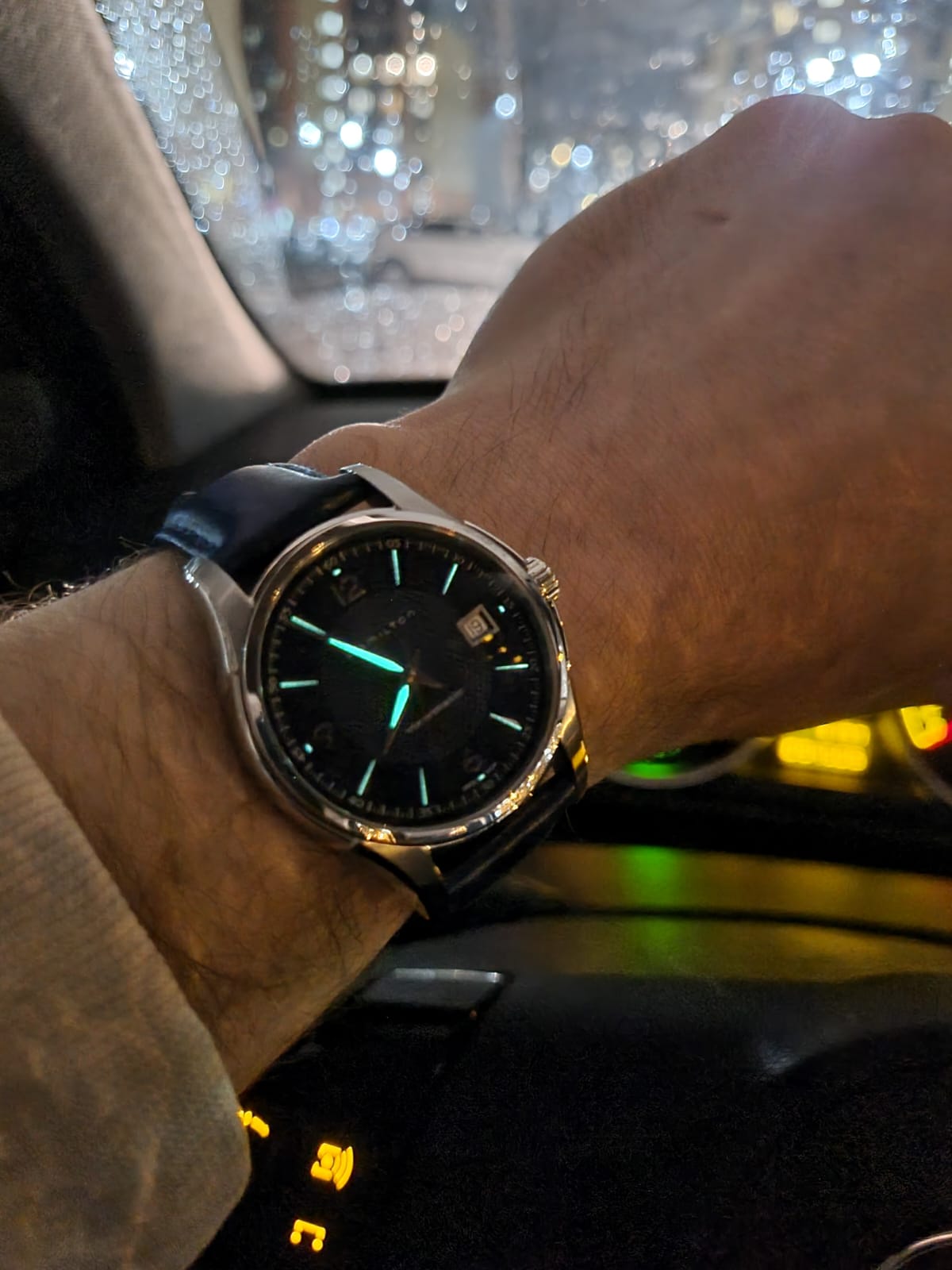 Очень красивые классические часы с индивидуальным дизайном. Привлекает глаз синий гильошированный циферблат с арабскими цифрами интересным шрифтом и метками, с зеркальной полировкой, которые переливаются блеском на солнце и без солнца). Стрелки и метки покрыты в середине суперлюминовой, вроде бы как напыления и не должно быть, а оно есть и работает, даже в таком утонченном виде! Окошко даты трапецевидной формы- тоже интересное решение.
