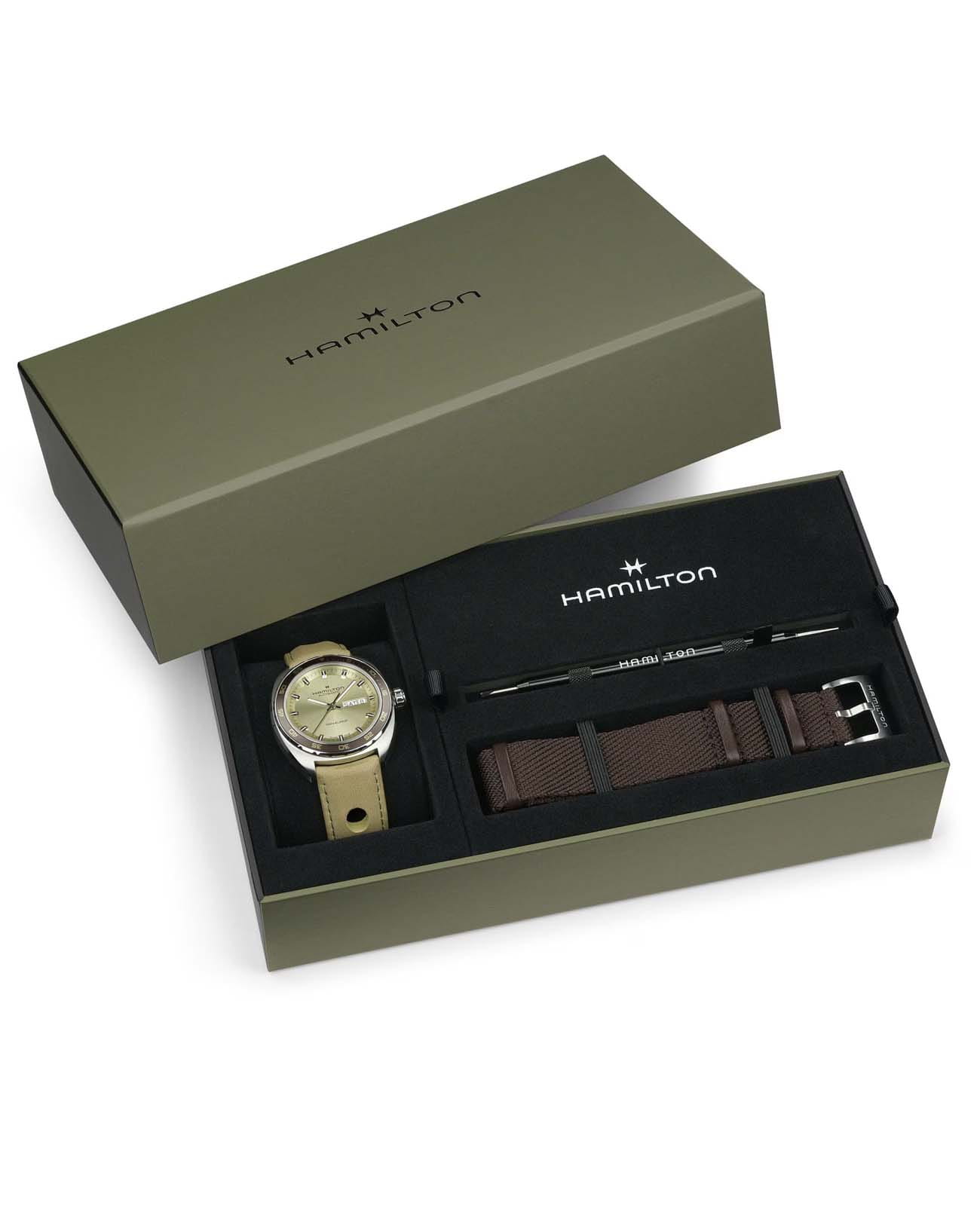 Мужские часы Hamilton American Classic Pan Europ Day Date Auto H35445860. Механизм с автоматическим подзаводом Сапфировое стеклоСапфировое стеклоПрочный и надёжный материал из кристалла сапфира синтетического происхождения, характеризующийся особой твёрдостью и устойчивостью к царапинам и повреждениям. устойчивое к появлению царапин, обладающее высокой прозрачностью. Класс водозащиты: 50 метров, позволит защитить корпус от случайных брызг или капель дождя. Корпус часов изготовлен из нержавеющей стали. Кожаный ремешок с раскладной застёжкойРаскладная застёжкаТакой тип застёжки используется только на браслетах из металла. Она никогда не раскрывается полностью, происходит разделение на 2 и более частей. Раскладывающая застёжка снизит вероятность потери часов к минимуму.. БезельБезельВнешний ободок, закрепляющий стекло. В спортивных часах так называется поворотное кольцо с делениями на циферблате, выполняет роль таймера – замеряет отрезки времени на шкале. Неподвижный безель – элемент декора. Однонаправленно вращающийся безель на дайверских часах позволяет фиксировать моменты погружения и выныривания на поверхность. с PVD-покрытиемPVDУльтратонкое покрытие наносится в технике вакуумного напыления, сочетает в себе нитрид титана особой прочности со слоем золота или оксида хрома. Несёт в себе декоративную или защитную функцию.. В комплект входит сменный тканевый ремешок. Стрелки и метки с люминесцентным покрытиемЛюминесцентное покрытиеПозволяет считывать показания времени в темноте. Производители наносят на стрелки, часовые индексы, безель или поверхность циферблата светонакопительный состав, дающий холодное свечение..