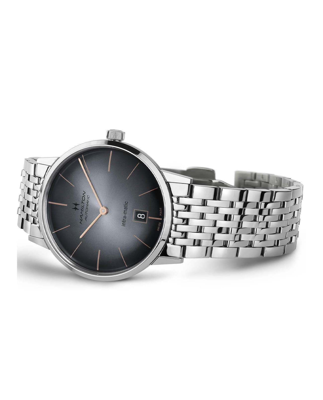 Мужские механические швейцарские часы Hamilton American Classic Intra-Matic Auto H38755181, автоматический механизм с высокой точностью. Сапфировое стеклоСапфировое стеклоПрочный и надёжный материал из кристалла сапфира синтетического происхождения, характеризующийся особой твёрдостью и устойчивостью к царапинам и повреждениям. устойчивое к появлению царапин, обладающее высокой прозрачностью. Класс водозащиты: 50 метров, позволит защитить корпус от случайных брызг или капель дождя. Корпус часов изготовлен из стали. Стальной браслет на застёжке-бабочке с кнопкамиЗастёжка "бабочка"Такой вид застёжки дополняется предохранителями, помогающими избежать случайного раскрытия браслета. Обладают изящным исполнением. .