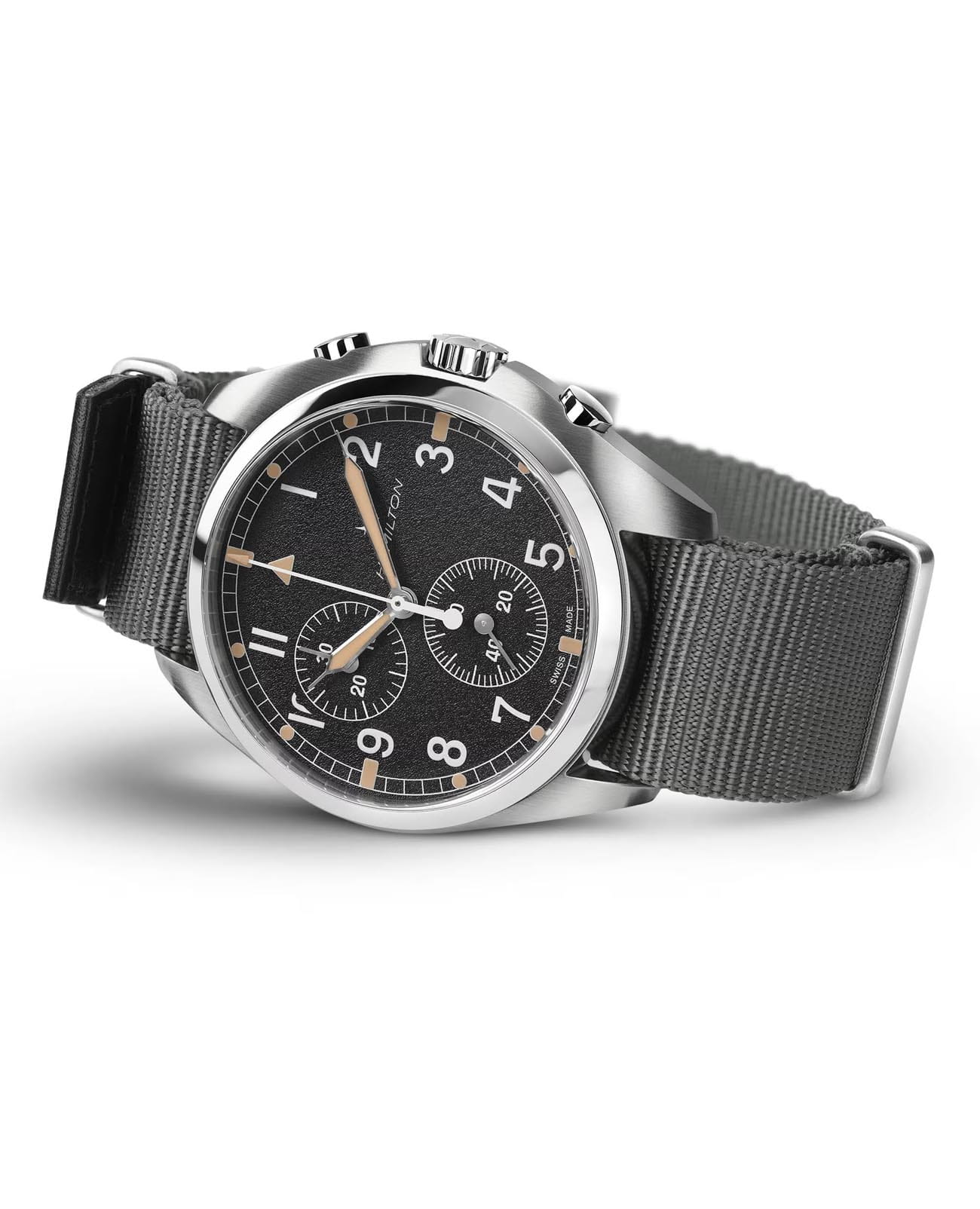 Мужские швейцарские часы-хронографХронографФункция позволяет измерять отрезки времени с особой точностью: часы, минуты, секунды. Верным признаком хронографа является наличие на циферблате 3 дополнительных окошек-счётчиков. с секундомеромСекундомерСекундоме́р — прибор, способный измерять интервалы времени с точностью до долей секунды. и надёжным кварцевым механизмом Hamilton Khaki Aviation Pilot Pioneer Chrono Quartz H76522931. Сапфировое стеклоСапфировое стеклоПрочный и надёжный материал из кристалла сапфира синтетического происхождения, характеризующийся особой твёрдостью и устойчивостью к царапинам и повреждениям. устойчивое к появлению царапин, обладающее высокой прозрачностью. Класс водозащиты: 100 метров, позволит плавать, нырять и заниматься другими водными видами спорта. Корпус часов изготовлен из стали. Тканевый ремешок на стандартной застёжке. Стрелки и метки с люминесцентным покрытиемЛюминесцентное покрытиеПозволяет считывать показания времени в темноте. Производители наносят на стрелки, часовые индексы, безель или поверхность циферблата светонакопительный состав, дающий холодное свечение..