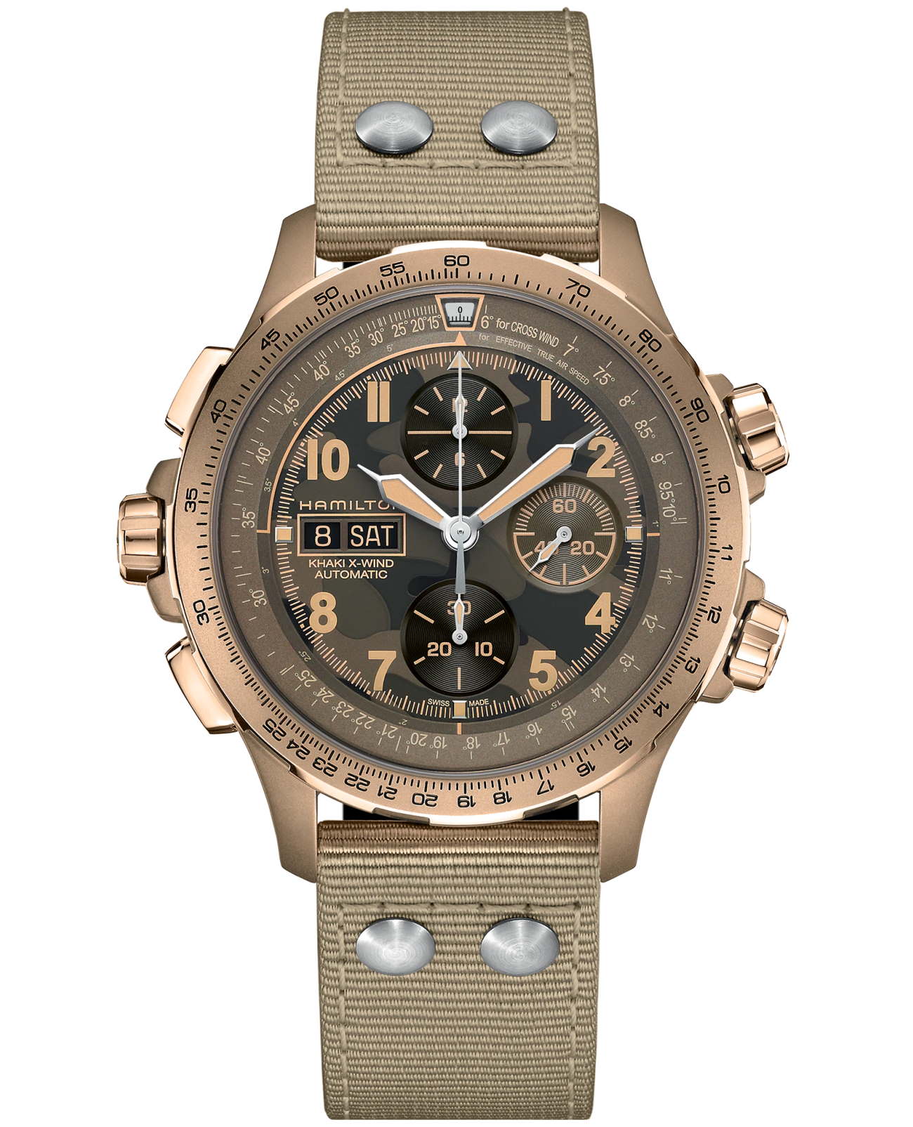 Авиационная модель Khaki Aviation X-Wind Automatic Chronograph H77916920 для любителей приключений уверенно держит курс, демонстрируя новый «мундир»: камуфляжный узор на циферблате и смелое цветовое оформление циферблата, корпуса и ремешка. Эта высокотехнологичная модель с вращающимся внутренним безелем и антимагнитной кремниевой спиралью отличается эффектным дизайном в стиле милитари.