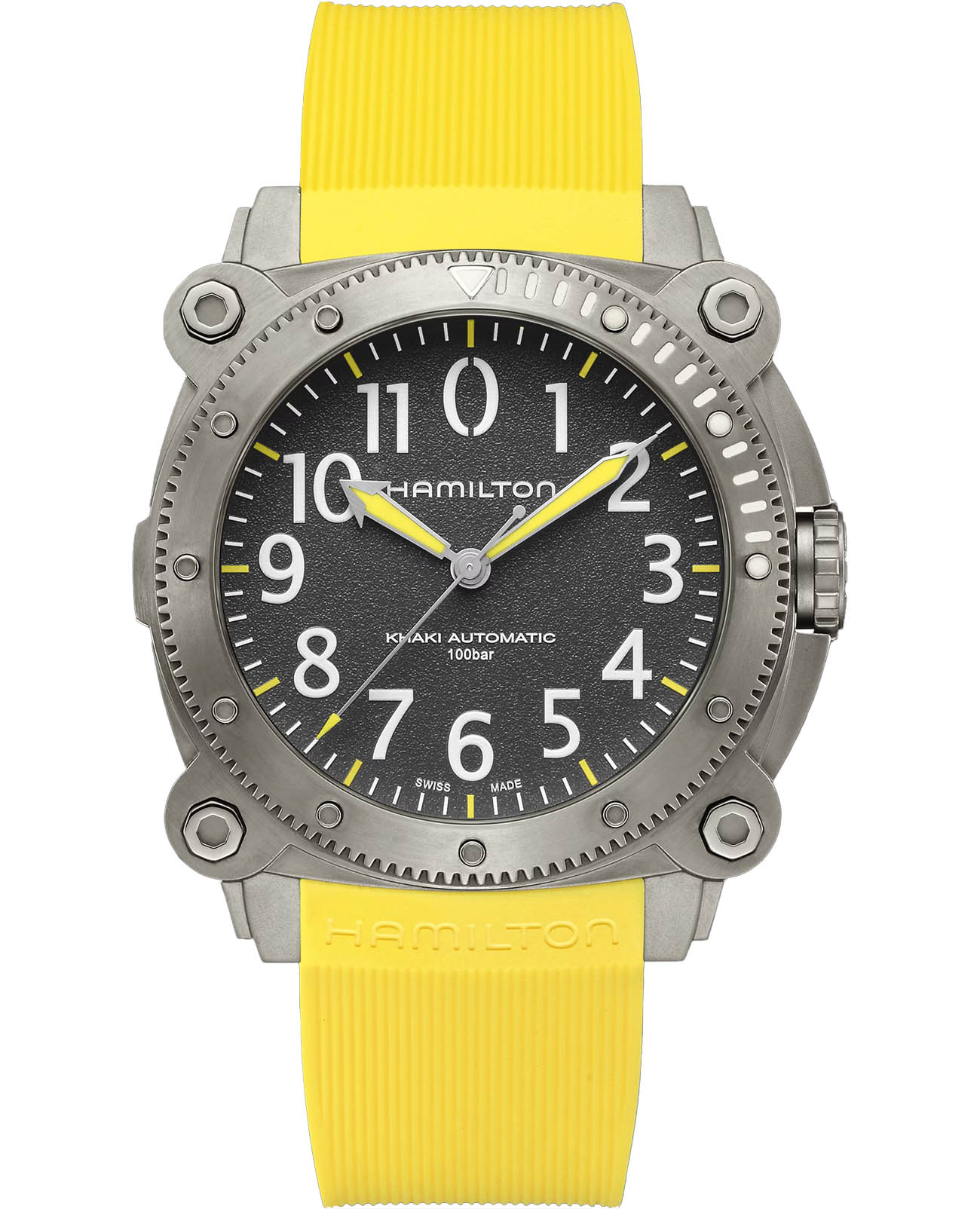 Модель Khaki Belowzero идеально подойдет даже для самых отчаянных глубоководных дайверов. Часы обладают водонепроницаемостью до 100 бар (1000 м) и оснащены гелиевым предохранительным клапаном. Выпуклое cапфировое стеклоСапфировое стеклоПрочный и надёжный материал из кристалла сапфира синтетического происхождения, характеризующийся особой твёрдостью и устойчивостью к царапинам и повреждениям. обеспечивает высокоэффективную защиту при подводных погружениях, а ярко-желтый каучуковый ремешок в сочетании с корпусом из матового титана диаметром 46 мм напоминает шлюз желтой подводной лодки. Это классические морские часы Hamilton для мореплавателей-первооткрывателей. Поворотный безельБезельВнешний ободок, закрепляющий стекло. В спортивных часах так называется поворотное кольцо с делениями на циферблате, выполняет роль таймера – замеряет отрезки времени на шкале. Неподвижный безель – элемент декора. Однонаправленно вращающийся безель на дайверских часах позволяет фиксировать моменты погружения и выныривания на поверхность. из титана.
