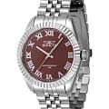 Женские наручные часы Invicta Specialty IN47412 сочетают в себе элегантный дизайн и надежность современных технологий . Модель обладает круглым корпусом, выполненным из нержавеющей стали, что обеспечивает высокую устойчивость к внешним воздействиям. БезельБезельВнешний ободок, закрепляющий стекло. В спортивных часах так называется поворотное кольцо с делениями на циферблате, выполняет роль таймера – замеряет отрезки времени на шкале. Неподвижный безель – элемент декора. Однонаправленно вращающийся безель на дайверских часах позволяет фиксировать моменты погружения и выныривания на поверхность. украшен рифленой отделкой с алмазной гранью, придающей часам дополнительную роскошь . Браслет также изготовлен из нержавеющей стали и оснащен раскладывающейся застежкойРаскладной замокДанный вариант застежки используется только на часах с металлическим браслетом. Отличительная особенность такого крепления в том, что длина браслета становится универсальной и вы можете самостоятельно отрегулировать нужный вам размер – застежка просто двигается по браслету часов., гарантирующей комфортное ношение и безопасность. Коричневый циферблат дополнен серебристыми стрелками и римскими цифрами в качестве часовых меток, а также минутными делениями по внешнему краю. Для защиты используется минеральное стеклоМинеральное стеклоМинеральное стекло представляет собой искусственно выращенный минерал кварца. Такое стекло отличается особой устойчивостью к повреждениям и царапинам. Уступает по некоторым качествам сапфировому стеклу., которое обеспечивает прочность и устойчивость к царапинам. Часы оснащены кварцевым механизмом калибра Seiko PC21, что гарантирует точность хода без необходимости подзаводки. Водонепроницаемость модели достигает 50 метров (5 атмосфер), что позволяет использовать их в повседневной жизни, включая контакт с водой, например, при мытье рук или дожде . Сочетание классического дизайна и функциональности делает эту модель универсальным аксессуаром для различных случаев жизни.