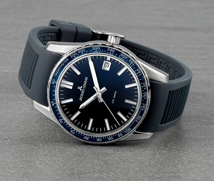 тахиметраТахиметрРазмеченная шкала, располагается на ободке или безеле часов. Тахиметр позволяет рассчитать скорость на определённом участке пути, расстояние измеряется в километрах или милях. вынесена на безельБезельВнешний ободок, закрепляющий стекло. В спортивных часах так называется поворотное кольцо с делениями на циферблате, выполняет роль таймера – замеряет отрезки времени на шкале. Неподвижный безель – элемент декора. Однонаправленно вращающийся безель на дайверских часах позволяет фиксировать моменты погружения и выныривания на поверхность.. В часах установлено ударопрочное минеральное стеклоМинеральное стеклоМинеральное стекло представляет собой искусственно выращенный минерал кварца. Такое стекло отличается особой устойчивостью к повреждениям и царапинам. Уступает по некоторым качествам сапфировому стеклу. Crystex. Повышенная водостойкость равна 10 атмосфер. Для создания ремешка был выбран силикон синего цвета. Силиконовый ремешок не деформируется со временем, не боится повышенной влажности и позволяет коже запястья дышать.