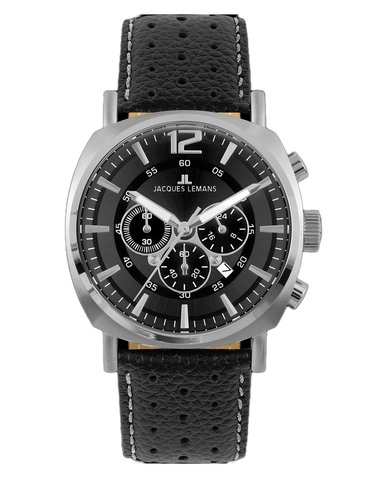 Часы Jacques Lemans Lugano 1-1645T — это эффектный мужской хронограф, сочетающий спортивный стиль и функциональность. Корпус диаметром 46 мм выполнен из нержавеющей стали. Чёрный циферблат с полировкой «солнечные лучи» оснащён индикатором 24-часового формата, минутным и секундным накопителями, а также окошком даты между 4 и 5 часами. Циферблат защищён минеральным стекломМинеральное стеклоМинеральное стекло представляет собой искусственно выращенный минерал кварца. Такое стекло отличается особой устойчивостью к повреждениям и царапинам. Уступает по некоторым качествам сапфировому стеклу. Crystex, устойчивым к царапинам.
