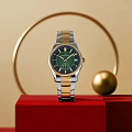 Кварцевые часы серии 1-2197 отличаются удобной индикацией секунд: для этого используется вынесенная на 6 часов стрелка и хорошо читаемые арабские цифры. Для определения часов и минут на зеленом циферблате расположены стрелки с люминесцентным покрытиемЛюминесцентное покрытиеПозволяет считывать показания времени в темноте. Производители наносят на стрелки, часовые индексы, безель или поверхность циферблата светонакопительный состав, дающий холодное свечение. и крупные накладные риски с полировкой. Окошко даты вынесено на 3 часа.