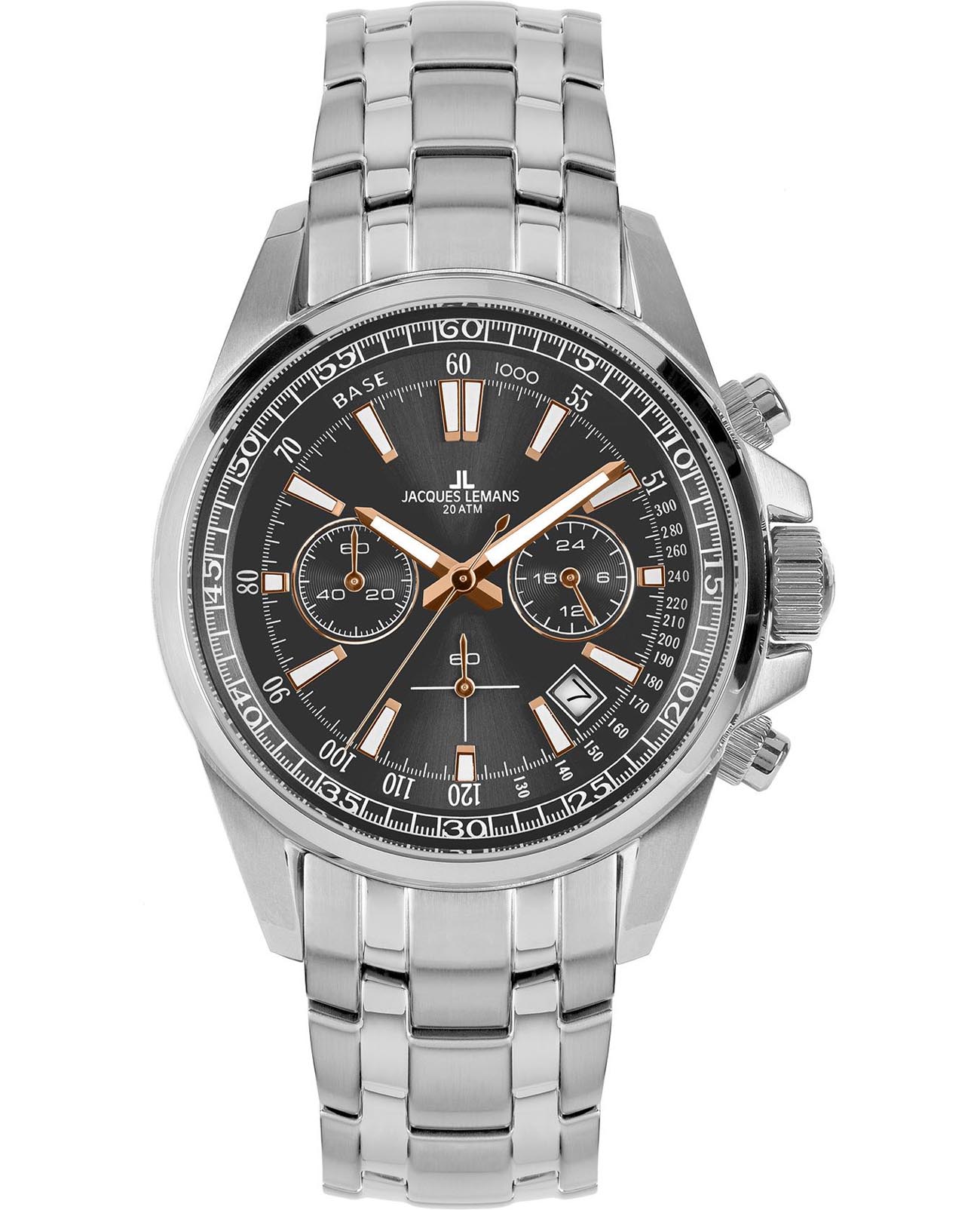 Мужские австрийские часы Jacques Lemans Liverpool 1-2117ZE c хронографомХронографФункция позволяет измерять отрезки времени с особой точностью: часы, минуты, секунды. Верным признаком хронографа является наличие на циферблате 3 дополнительных окошек-счётчиков., кварцевый механизм с высокой точностью. Минеральное стеклоМинеральное стеклоМинеральное стекло представляет собой искусственно выращенный минерал кварца. Такое стекло отличается особой устойчивостью к повреждениям и царапинам. Уступает по некоторым качествам сапфировому стеклу. устойчивое к мелким механическим повреждениям. Класс водозащиты: 200 метров, позволит плавать, нырять и заниматься другими водными видами спорта. Корпус часов изготовлен из стали. Стальной браслет на раскладной застёжкеРаскладная застёжкаТакой тип застёжки используется только на браслетах из металла. Она никогда не раскрывается полностью, происходит разделение на 2 и более частей. Раскладывающая застёжка снизит вероятность потери часов к минимуму.. Стрелки и метки с люминесцентным покрытиемЛюминесцентное покрытиеПозволяет считывать показания времени в темноте. Производители наносят на стрелки, часовые индексы, безель или поверхность циферблата светонакопительный состав, дающий холодное свечение..