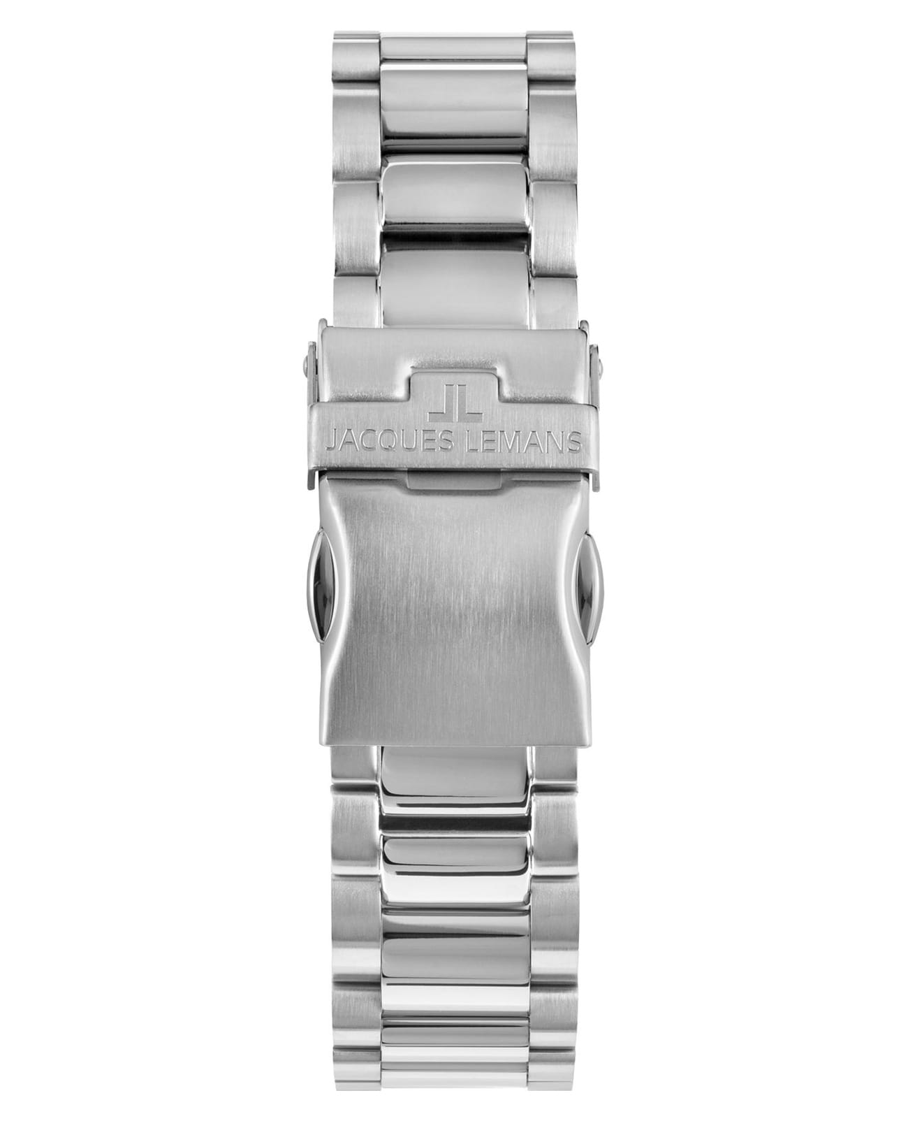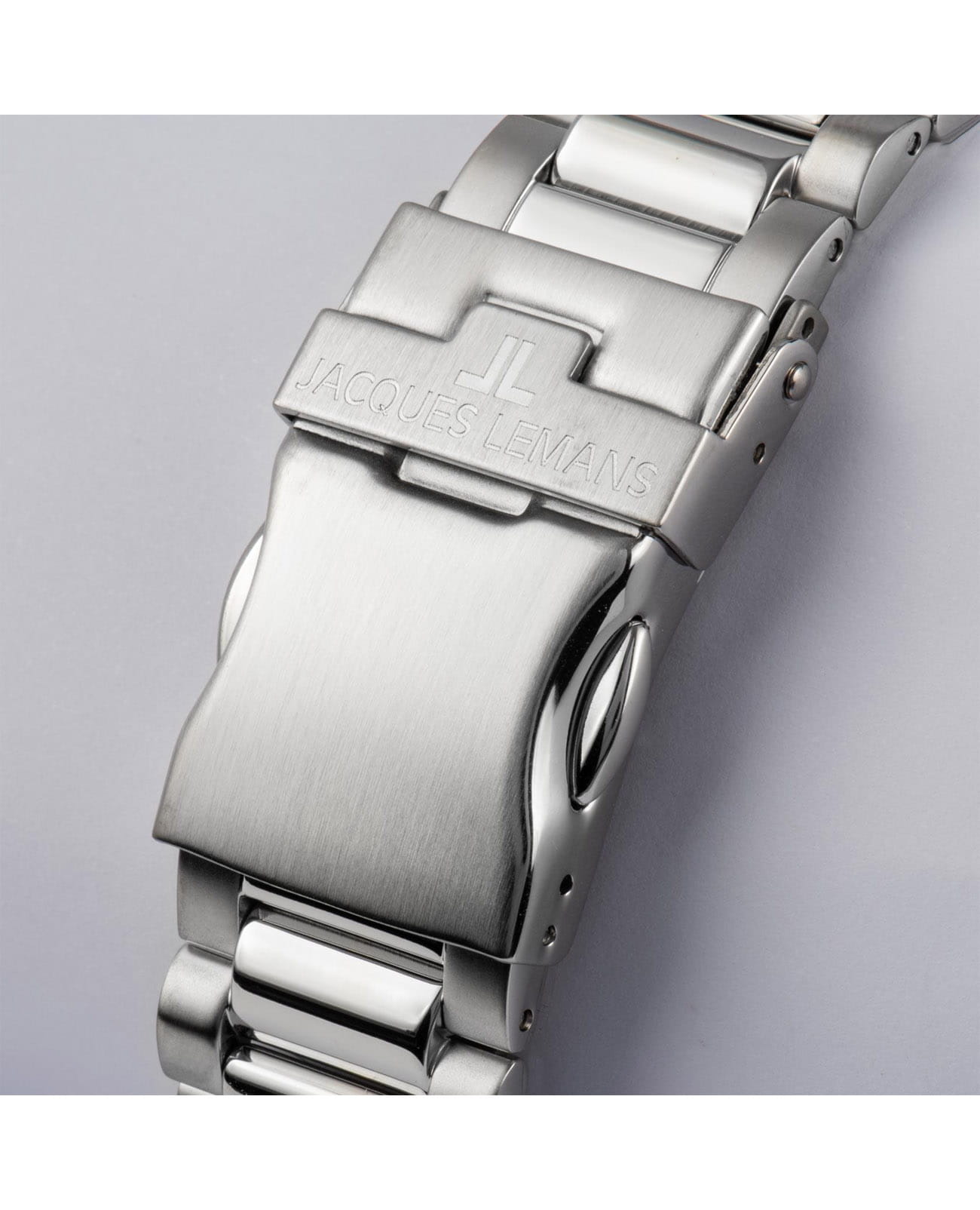 Мужские часы Jacques Lemans Hybromatic 1-2170H с минеральным стекломМинеральное стеклоМинеральное стекло представляет собой искусственно выращенный минерал кварца. Такое стекло отличается особой устойчивостью к повреждениям и царапинам. Уступает по некоторым качествам сапфировому стеклу., гибрид кварца и механики с автоподзаводом. Корпус выполенен из нержавеющей стали. Вращающийся безельБезельВнешний ободок, закрепляющий стекло. В спортивных часах так называется поворотное кольцо с делениями на циферблате, выполняет роль таймера – замеряет отрезки времени на шкале. Неподвижный безель – элемент декора. Однонаправленно вращающийся безель на дайверских часах позволяет фиксировать моменты погружения и выныривания на поверхность. из нержавеющей стали с PVDPVDУльтратонкое покрытие наносится в технике вакуумного напыления, сочетает в себе нитрид титана особой прочности со слоем золота или оксида хрома. Несёт в себе декоративную или защитную функцию. покрытием. Стрелки и метки с люминесцентным покрытиемЛюминесцентное покрытиеПозволяет считывать показания времени в темноте. Производители наносят на стрелки, часовые индексы, безель или поверхность циферблата светонакопительный состав, дающий холодное свечение.. Окошко даты находится в положении 3 часов. Класс водозащиты: 200 метров, позволит плавать, нырять и заниматься другими водными видами спорта. Стальной браслет на раскладной застёжкеРаскладная застёжкаТакой тип застёжки используется только на браслетах из металла. Она никогда не раскрывается полностью, происходит разделение на 2 и более частей. Раскладывающая застёжка снизит вероятность потери часов к минимуму..