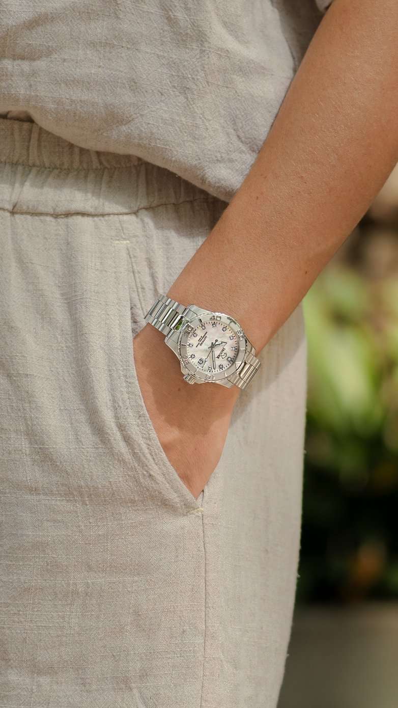 Женские швейцарские часы Jaguar Couple Diver J870/1. Кварцевый швейцарский калибр Ronda 705. Сапфировое стеклоСапфировое стеклоПрочный и надёжный материал из кристалла сапфира синтетического происхождения, характеризующийся особой твёрдостью и устойчивостью к царапинам и повреждениям. устойчивое к мелким механическим повреждениям. Корпус и браслет часов изготовлены из нержавеющей стали. Стрелки с люминесцентным покрытиемЛюминесцентное покрытиеПозволяет считывать показания времени в темноте. Производители наносят на стрелки, часовые индексы, безель или поверхность циферблата светонакопительный состав, дающий холодное свечение.. Окошко даты находится в положении 3 часа. Класс водозащиты: 200 метров, позволит плавать, нырять и заниматься другими водными видами спорта. Стальной браслет на раскладной застёжкеРаскладная застёжкаТакой тип застёжки используется только на браслетах из металла. Она никогда не раскрывается полностью, происходит разделение на 2 и более частей. Раскладывающая застёжка снизит вероятность потери часов к минимуму.. Циферблат украшен 11 кристаллами в роли часовых индексов.