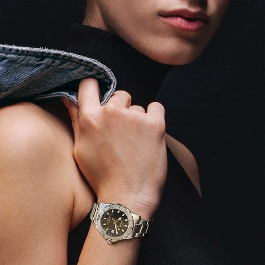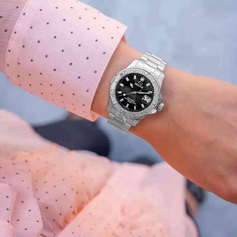 Женские швейцарские часы Jaguar Couple Diver J870/4. Кварцевый швейцарский калибр Ronda 705. Сапфировое стеклоСапфировое стеклоПрочный и надёжный материал из кристалла сапфира синтетического происхождения, характеризующийся особой твёрдостью и устойчивостью к царапинам и повреждениям. устойчивое к мелким механическим повреждениям. Корпус и браслет часов изготовлены из нержавеющей стали. Стрелки и метки с люминесцентным покрытиемЛюминесцентное покрытиеПозволяет считывать показания времени в темноте. Производители наносят на стрелки, часовые индексы, безель или поверхность циферблата светонакопительный состав, дающий холодное свечение.. Окошко даты находится в положении 3 часа. Класс водозащиты: 200 метров, позволит плавать, нырять и заниматься другими водными видами спорта. Стальной браслет на раскладной застёжкеРаскладная застёжкаТакой тип застёжки используется только на браслетах из металла. Она никогда не раскрывается полностью, происходит разделение на 2 и более частей. Раскладывающая застёжка снизит вероятность потери часов к минимуму.. Циферблат украшен кристаллом.