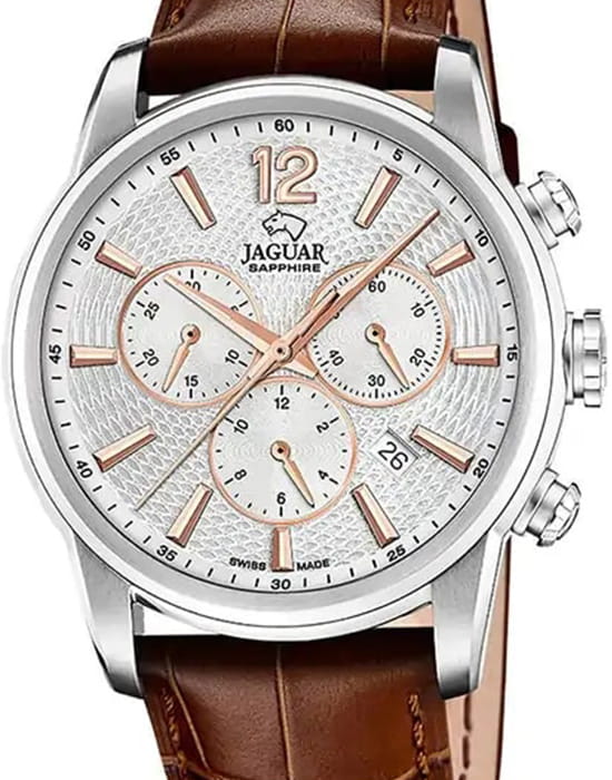 Jaguar J968/1 из коллекции Acamar — элегантные мужские часы, сочетающие швейцарское качество и современный дизайн. Корпус диаметром 42 мм выполнен из нержавеющей стали, что обеспечивает прочность и долговечность. Сапфировое стеклоСапфировое стеклоПрочный и надёжный материал из кристалла сапфира синтетического происхождения, характеризующийся особой твёрдостью и устойчивостью к царапинам и повреждениям. защищает циферблат от царапин и повреждений. Серебристый циферблат с розово-золотыми стрелками и индексами подчёркивает утончённый стиль. Часы оснащены хронографом с центральной секундной стрелкой (1/1 сек.), 30-минутным и 12-часовым счётчиками, а также функцией индикации даты, расположенной в окошке на отметке «4 часа». Ремешок из коричневой кожи обеспечивает комфортное ношение. Классическая застёжка гарантирует надёжную фиксацию. Водозащита до 5 ATM (50 метров) делает часы подходящими для повседневного использования. Jaguar J968/1 — это идеальный выбор для мужчин, которые ценят классический дизайн, функциональность и швейцарское качество.