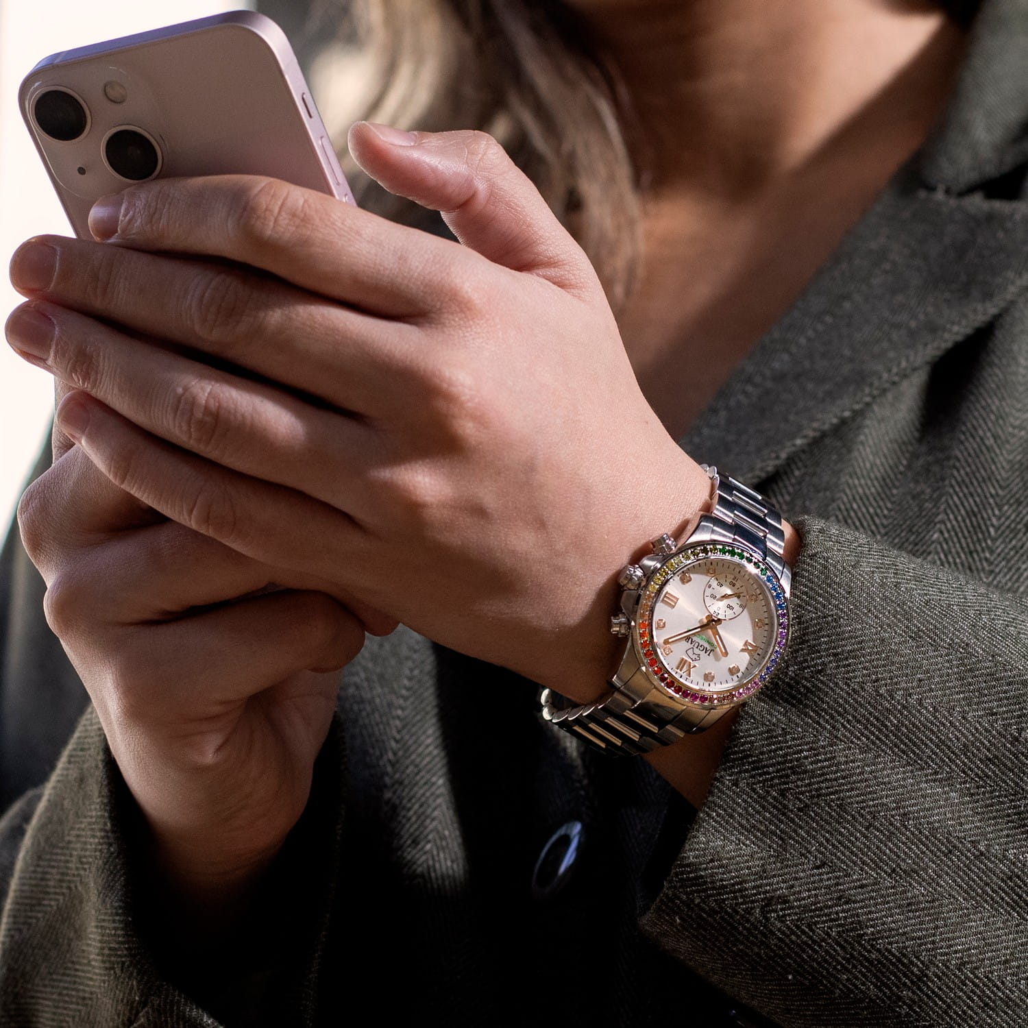 Женские швейцарские часы Jaguar Connected Lady J980/4. Сапфировое стеклоСапфировое стеклоПрочный и надёжный материал из кристалла сапфира синтетического происхождения, характеризующийся особой твёрдостью и устойчивостью к царапинам и повреждениям. устойчивое к мелким механическим повреждениям. Корпус и браслет часов изготовлены из нержавеющей стали. Стрелки и метки с люминесцентным покрытиемЛюминесцентное покрытиеПозволяет считывать показания времени в темноте. Производители наносят на стрелки, часовые индексы, безель или поверхность циферблата светонакопительный состав, дающий холодное свечение.. Класс водозащиты: 50 метров, позволит защитить корпус от случайных брызг или капель дождя. БезельБезельВнешний ободок, закрепляющий стекло. В спортивных часах так называется поворотное кольцо с делениями на циферблате, выполняет роль таймера – замеряет отрезки времени на шкале. Неподвижный безель – элемент декора. Однонаправленно вращающийся безель на дайверских часах позволяет фиксировать моменты погружения и выныривания на поверхность. и циферблат инкрустированный цирконием. Стальной браслет на раскладной застёжкеРаскладная застёжкаТакой тип застёжки используется только на браслетах из металла. Она никогда не раскрывается полностью, происходит разделение на 2 и более частей. Раскладывающая застёжка снизит вероятность потери часов к минимуму.. За точный ход работы часов, из коллекции Connected, отвечает кварцевый гибридный механизм швейцарского производства со Смарт-Модулем. Данный тип механизма обеспечивает возможность подключить часы к телефону через Bluetooth и управлять большим рядом дополнительных функций на выбор с помошью приложения Jaguar. Дополнительные функции: отображение даты и дня недели, секундомер, таймер, GMT, шагомер, поиск телефона, включение/выключение звука телефона при входящих вызовах, переключение музыки, вибро-уведомления.