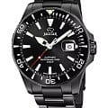 Мужские швейцарские часы Jaguar Executive Diver J989/1. Кварцевый швейцарский калибр Ronda 6003D. Сапфировое стеклоСапфировое стеклоПрочный и надёжный материал из кристалла сапфира синтетического происхождения, характеризующийся особой твёрдостью и устойчивостью к царапинам и повреждениям. устойчивое к мелким механическим повреждениям. Корпус и браслет часов изготовлены из нержавеющей стали с PVD-покрытиемPVDУльтратонкое покрытие наносится в технике вакуумного напыления, сочетает в себе нитрид титана особой прочности со слоем золота или оксида хрома. Несёт в себе декоративную или защитную функцию.. Стрелки и метки с люминесцентным покрытиемЛюминесцентное покрытиеПозволяет считывать показания времени в темноте. Производители наносят на стрелки, часовые индексы, безель или поверхность циферблата светонакопительный состав, дающий холодное свечение.. Окошко даты находится в положении 3 часа. Класс водозащиты: 200 метров, позволит плавать, нырять и заниматься другими водными видами спорта. Стальной браслет на раскладной застёжкеРаскладная застёжкаТакой тип застёжки используется только на браслетах из металла. Она никогда не раскрывается полностью, происходит разделение на 2 и более частей. Раскладывающая застёжка снизит вероятность потери часов к минимуму.. БезельБезельВнешний ободок, закрепляющий стекло. В спортивных часах так называется поворотное кольцо с делениями на циферблате, выполняет роль таймера – замеряет отрезки времени на шкале. Неподвижный безель – элемент декора. Однонаправленно вращающийся безель на дайверских часах позволяет фиксировать моменты погружения и выныривания на поверхность. с PVD-покрытиемPVDУльтратонкое покрытие наносится в технике вакуумного напыления, сочетает в себе нитрид титана особой прочности со слоем золота или оксида хрома. Несёт в себе декоративную или защитную функцию..