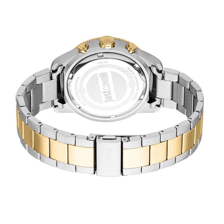 JUST CAVALLI JC1G243M0275 — стильные итальянские часы с функцией хронографаХронографФункция позволяет измерять отрезки времени с особой точностью: часы, минуты, секунды. Верным признаком хронографа является наличие на циферблате 3 дополнительных окошек-счётчиков. и секундомераСекундомерСекундоме́р — прибор, способный измерять интервалы времени с точностью до долей секунды., которые сочетают в себе элегантность и современный функционал. Круглый корпус диаметром 42 мм выполнен из нержавеющей стали, толщина корпуса составляет 11 мм, а на безельБезельВнешний ободок, закрепляющий стекло. В спортивных часах так называется поворотное кольцо с делениями на циферблате, выполняет роль таймера – замеряет отрезки времени на шкале. Неподвижный безель – элемент декора. Однонаправленно вращающийся безель на дайверских часах позволяет фиксировать моменты погружения и выныривания на поверхность. нанесено PVD-покрытиеPVDУльтратонкое покрытие наносится в технике вакуумного напыления, сочетает в себе нитрид титана особой прочности со слоем золота или оксида хрома. Несёт в себе декоративную или защитную функцию., что придает модели выразительный внешний вид и надежную защиту от внешних воздействий. Часы оснащены кварцевым механизмом, также обладают функцией отображения даты, что делает их удобными для ежедневного использования. Минеральное стеклоМинеральное стеклоМинеральное стекло представляет собой искусственно выращенный минерал кварца. Такое стекло отличается особой устойчивостью к повреждениям и царапинам. Уступает по некоторым качествам сапфировому стеклу. защищает часы от царапин, а водозащита 100 метров позволяет не снимать их во время плавания и занятий спортом. Стальной браслет с частичным PVD-покрытиемPVDУльтратонкое покрытие наносится в технике вакуумного напыления, сочетает в себе нитрид титана особой прочности со слоем золота или оксида хрома. Несёт в себе декоративную или защитную функцию. на раскладной застёжкеРаскладная застёжкаТакой тип застёжки используется только на браслетах из металла. Она никогда не раскрывается полностью, происходит разделение на 2 и более частей. Раскладывающая застёжка снизит вероятность потери часов к минимуму. обеспечивает комфортное ношение. Стрелки и метки с люминесцентным покрытиемЛюминесцентное покрытиеПозволяет считывать показания времени в темноте. Производители наносят на стрелки, часовые индексы, безель или поверхность циферблата светонакопительный состав, дающий холодное свечение. обеспечивают отличную читаемость в любое время суток.