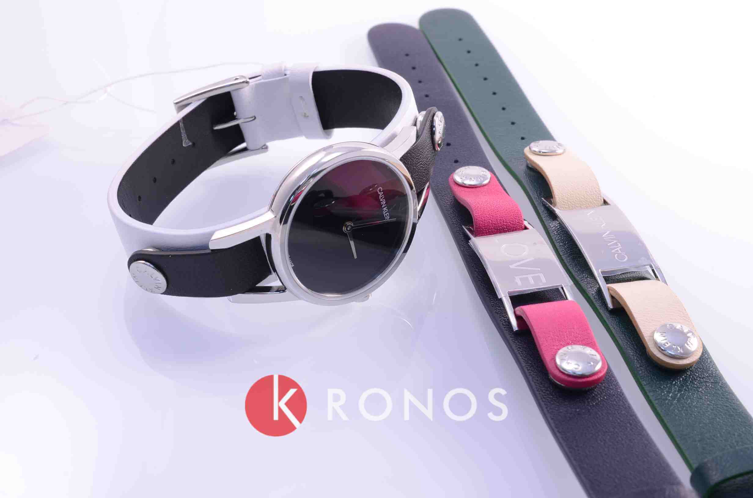 Модель поставляется в комплекте с цветными кожаными ремешками, кнопки позволяют менять его по желанию. Неиспользуемые элементы можно носить как отдельный браслет. Швейцарский кварцевый калибр ETA F05.101 отвечает за высокую точность хода. Минеральное стекло отличается надёжностью, устойчивостью к царапинам.