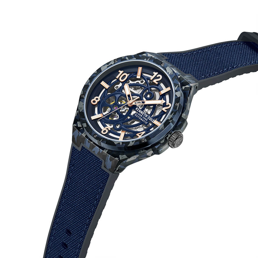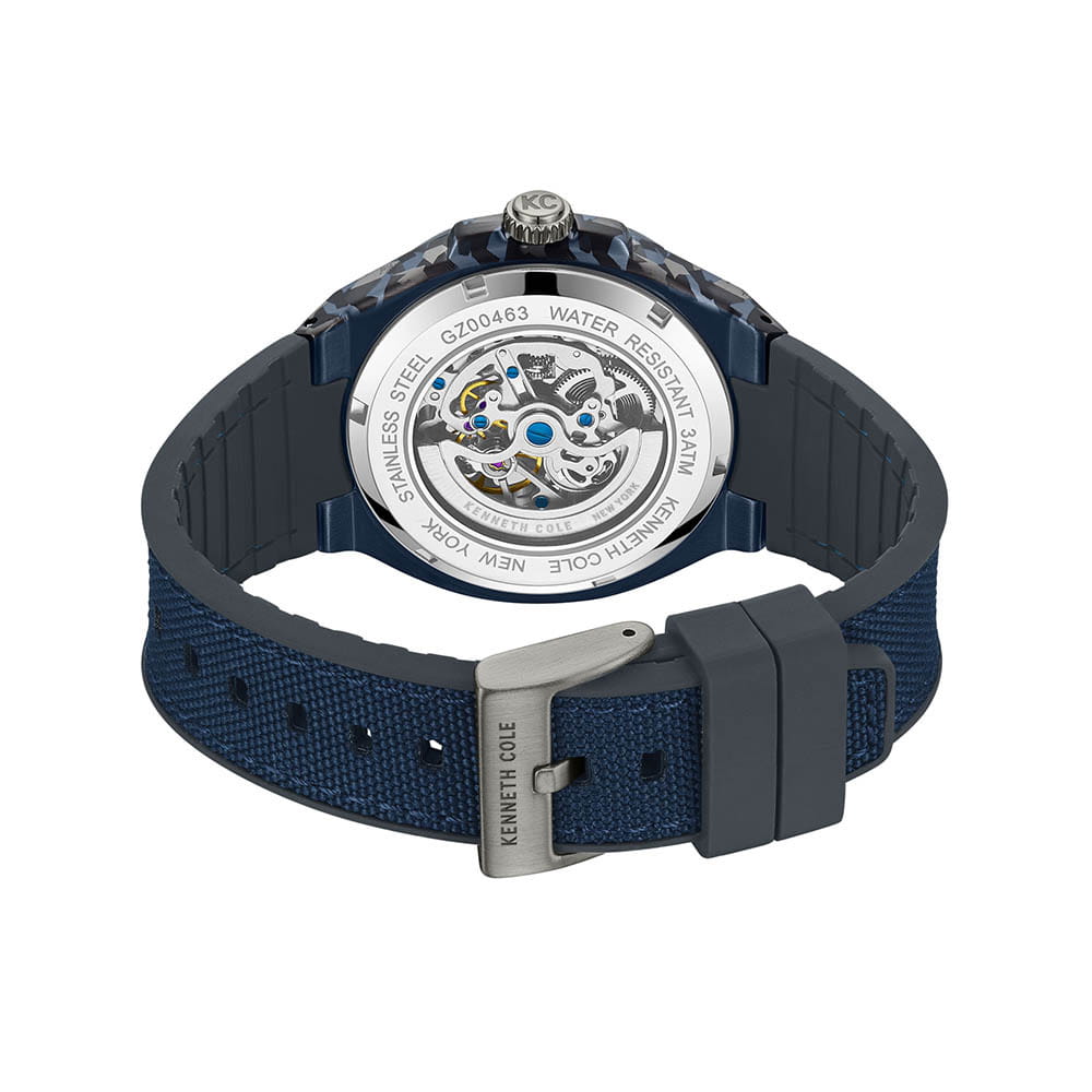 Мужские механические часы с автоподзаводом Kenneth Cole KCWGZ0046301 — это выразительный аксессуар, сочетающий современный дизайн и функциональность. Корпус размером 43,5 × 51,5 мм выполнен из стали с IP-покрытиемIP-покрытиеМетод ионного напыления. Демонстрирует повышенную устойчивость к истиранию, окислению и химическим веществам. Под воздействием высокого давления и температуры около 1500°C молекулы металла надёжно соединяются с частицами корпуса часов. в сочетании синего и чёрного цветов, что придаёт модели динамичный и технологичный вид. Циферблат синего цвета частично скелетонизирован, открывая взгляду элементы механизма и подчёркивая инженерную изысканность. Циферблат защищён минеральным стекломМинеральное стеклоМинеральное стекло представляет собой искусственно выращенный минерал кварца. Такое стекло отличается особой устойчивостью к повреждениям и царапинам. Уступает по некоторым качествам сапфировому стеклу.. Индексы представлены в виде арабских цифр и штрихов, а стрелки оснащены люминесцентным покрытиемЛюминесцентное покрытиеПозволяет считывать показания времени в темноте. Производители наносят на стрелки, часовые индексы, безель или поверхность циферблата светонакопительный состав, дающий холодное свечение., обеспечивающим хорошую читаемость в темноте. Часы оснащены комбинированным ремешком из силикона и нейлона синего цвета с классической пряжкой, что гарантирует комфорт и надёжность ношения. Водонепроницаемость 30 м позволяет использовать часы в повседневных условиях, защищая от случайных брызг и капель дождя. Сочетание стиля, прочности и современных материалов делает эти часы универсальным выбором для активного и уверенного в себе мужчины.