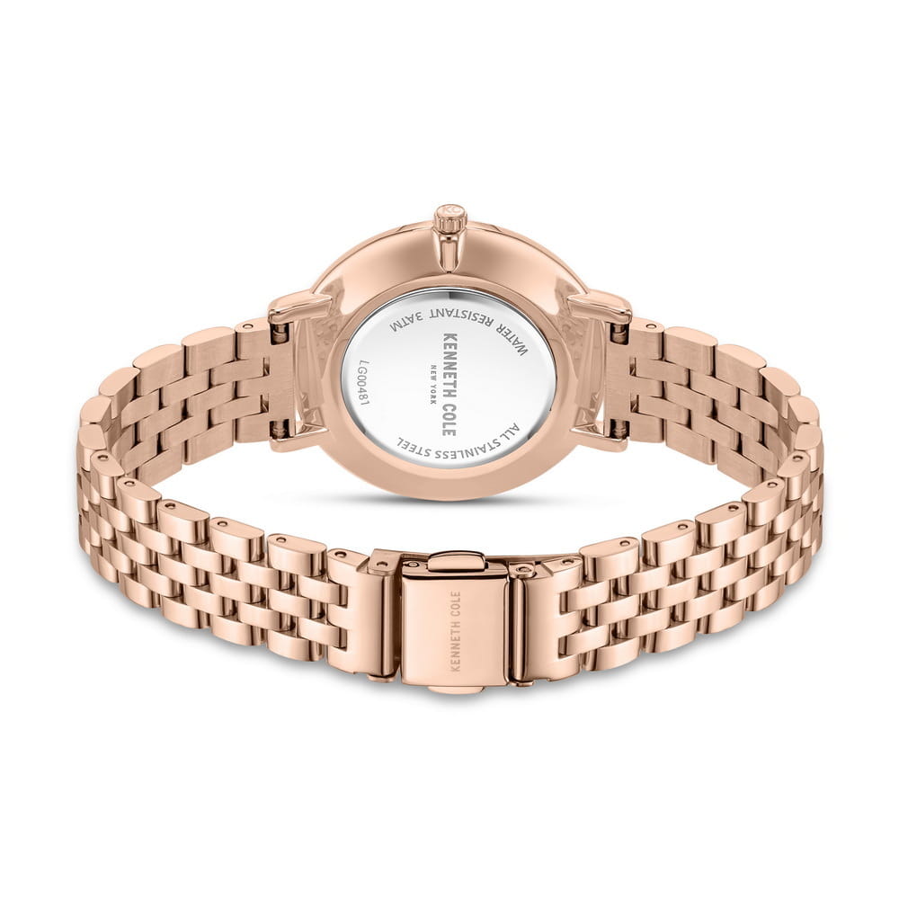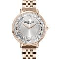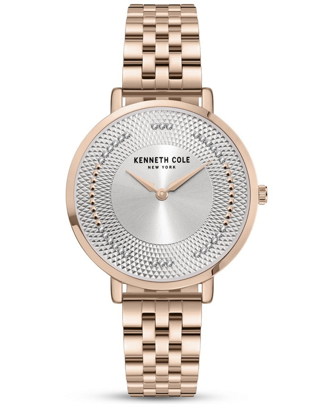 Женские кварцевые часы Kenneth Cole KCWLG0048101 — это элегантный аксессуар, подчеркивающий женственность и стиль. Корпус диаметром 34 мм выполнен из стали с IP-покрытиемIP-покрытиеМетод ионного напыления. Демонстрирует повышенную устойчивость к истиранию, окислению и химическим веществам. Под воздействием высокого давления и температуры около 1500°C молекулы металла надёжно соединяются с частицами корпуса часов. розового золота. Циферблат стального цвета украшен вставками из стразов из стекла, придающими сияние и изысканность. Циферблат защищён минеральным стекломМинеральное стеклоМинеральное стекло представляет собой искусственно выращенный минерал кварца. Такое стекло отличается особой устойчивостью к повреждениям и царапинам. Уступает по некоторым качествам сапфировому стеклу.. Часы оснащены стальным браслетом с IP-покрытиемIP-покрытиеМетод ионного напыления. Демонстрирует повышенную устойчивость к истиранию, окислению и химическим веществам. Под воздействием высокого давления и температуры около 1500°C молекулы металла надёжно соединяются с частицами корпуса часов. розового золота на раскладной застёжкеРаскладная застёжкаТакой тип застёжки используется только на браслетах из металла. Она никогда не раскрывается полностью, происходит разделение на 2 и более частей. Раскладывающая застёжка снизит вероятность потери часов к минимуму.. Водонепроницаемость 30 м позволяет использовать часы в повседневных условиях, защищая от случайных брызг и капель дождя. Утончённый образ и внимание к деталям делают эти часы идеальным дополнением к любому образу.