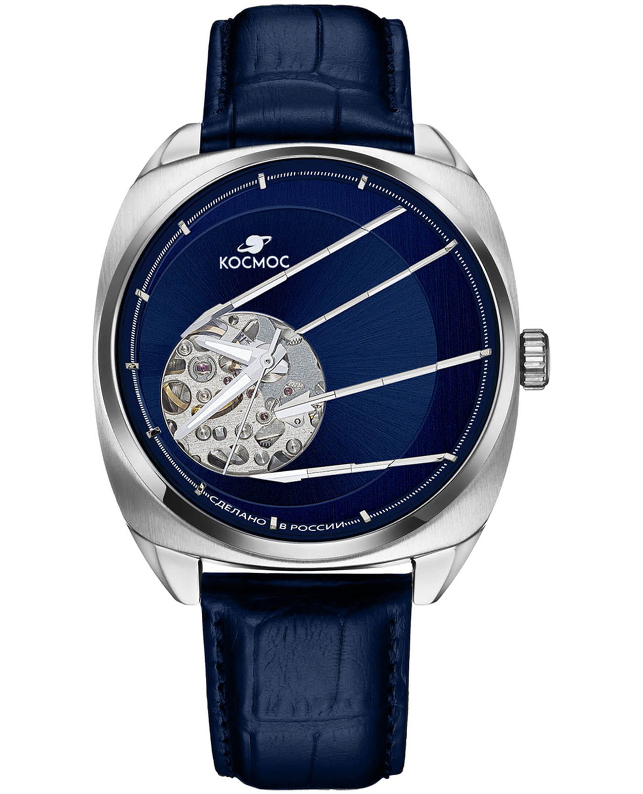 Мужские наручные часы Космос Спутник K 115.16.36 — это уникальная лимитированная серия, созданная в честь исторического запуска первого искусственного спутника Земли. В корпусе необычной круглой формы, выполненном из гипоаллергенной нержавеющей стали, работает надежный механический механизм с автоподзаводом от японской компании Seiko. Прозрачная задняя крышка, закрепленная на четырех винтах, открывает вид на сложный механизм, а на самой крышке указан индивидуальный номер модели в формате хх/50. Скелетонизированный синий циферблат защищен сапфировым стекломСапфировое стеклоПрочный и надёжный материал из кристалла сапфира синтетического происхождения, характеризующийся особой твёрдостью и устойчивостью к царапинам и повреждениям. с антибликовым покрытиемАнтибликовое покрытиеСлой оксида металла в 0,13-0,3 микрон, благодаря которому стекло часов не бликует и не отражает свет. Антибликовое покрытие уменьшает отражение света в 10 раз, обеспечивая отличную читаемость показателей циферблата., которое обеспечивает максимальную устойчивость к царапинам и идеальную видимость в любых условиях. Украшением циферблата служат крупные стрелки с люминесцентным покрытиемЛюминесцентное покрытиеПозволяет считывать показания времени в темноте. Производители наносят на стрелки, часовые индексы, безель или поверхность циферблата светонакопительный состав, дающий холодное свечение., а также специальная апертура, окаймленная элементами, напоминающими антенны Спутника. Часовая и минутная стрелки отлично читаются благодаря своему размеру и светящемуся покрытию. Браслет из натуральной кожи синего цвета дополнен удобной застежкой-бабочкой с двумя боковыми кнопкамиЗастёжка "бабочка"Такой вид застёжки дополняется предохранителями, помогающими избежать случайного раскрытия браслета. Обладают изящным исполнением. , что гарантирует надежную фиксацию на руке. Водозащита до 10 атм (WR100) позволяет использовать часы при плавании и других водных видах спорта без акваланга. Коллекция Спутник — это выбор для ценителей истории космических достижений и современных технологий.