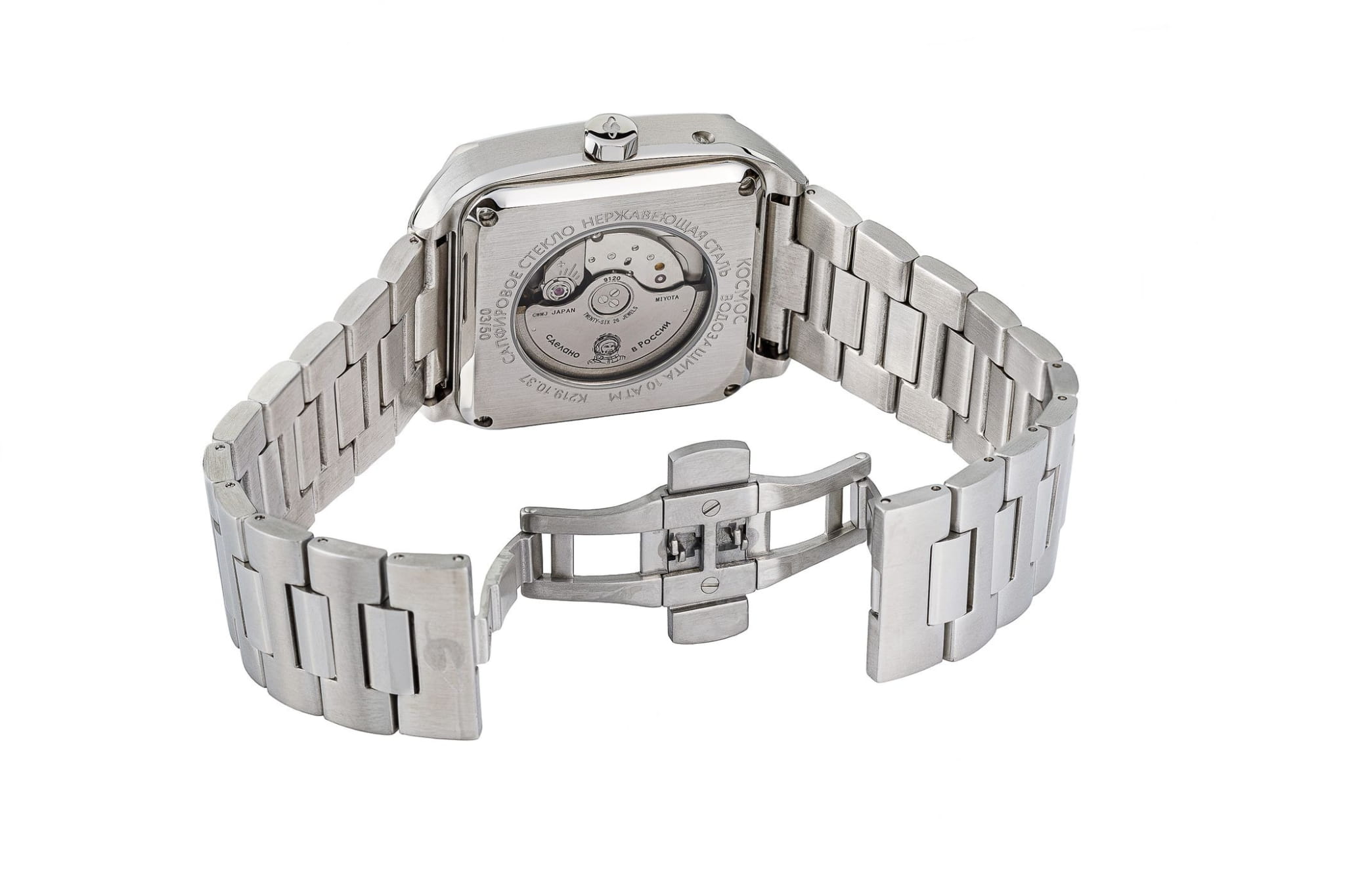 Мужские наручные часы Космос Марсоход II K 219.10.31 — это уникальная лимитированная серия, посвященная аппарату, способному передвигаться по поверхности Красной планеты. Марсоход ассоциируется с брутальностью, мастерством и технической сложностью. Наша страна дважды запускала подобные аппараты еще в 70-х годах прошлого века. Дизайн часов серии Марсоход вдохновлен лучшими работами советских мастеров, сочетая современные технологии часового искусства с обаянием стиля ретро. Корпус в форме квадрата с закругленными углами выполнен из нержавеющей стали украшенной зеркальной полировкой и сатинированием. Удобная заводная головка имеет форму гайки, что добавляет модели индустриальный шарм. Задняя крышка прозрачная, закрепленная на четырех винтах, и позволяет увидеть работу механизма TMI с подвижным ротором, на котором гравируется надпись «Сделано в России». Также здесь представлена гравировка с изображением космонавта, придающая часам особую значимость. Водостойкость достигает 10 атм (WR100), что позволяет использовать часы при плавании и других водных видах спорта. На задней крышке указан индивидуальный номер модели в формате от 01/50 до 50/50. Объемный циферблат состоит из двух уровней. В центре движутся три стрелки, часовая и минутная из которых имеют люминесцентное покрытиеЛюминесцентное покрытиеПозволяет считывать показания времени в темноте. Производители наносят на стрелки, часовые индексы, безель или поверхность циферблата светонакопительный состав, дающий холодное свечение., позволяющее определять время даже в темноте. Также, здесь расположили три дополнительных индикатора: день недели, месяц и время в формате 24-х часов. Для обозначения дня недели и месяца используется кириллица. Окошко даты между 4 и 5 часами выделено накладной рамкой. Циферблат защищен прочным сапфировым стеклом с антибликовым покрытиемСапфировое стеклоПрочный и надёжный материал из кристалла сапфира синтетического происхождения, характеризующийся особой твёрдостью и устойчивостью к царапинам и повреждениям., обеспечивающим отличную читаемость показаний в любых условиях. Второй уровень декорирован гильоше в виде солнечных лучей, на нем закреплены накладные индексы. Браслет изготовлен из литых стальных звеньев нержавеющей стали и оснащен удобной застёжкой «бабочка» с кнопкамиЗастёжка "бабочка"Такой вид застёжки дополняется предохранителями, помогающими избежать случайного раскрытия браслета. Обладают изящным исполнением. , которая сводит к минимуму вероятность потери. Заводная головка, застежка и браслет украшены фирменным логотипом бренда. Коллекция Марсоход — идеальный выбор для ценителей истории космических достижений и современных технологий.