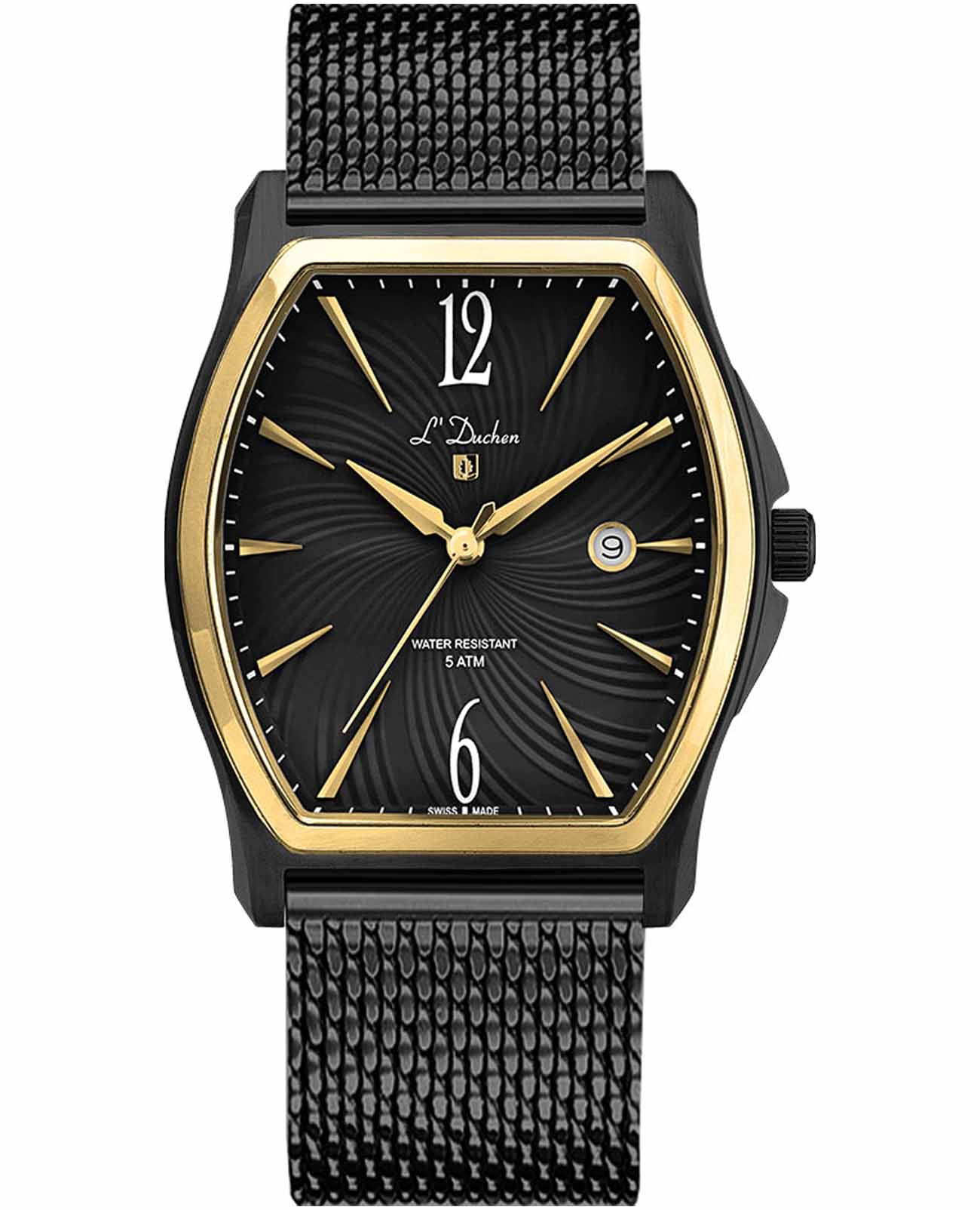 Мужские швейцарские L'Duchen Muse D 301.81.21 M, кварцевый механизм с высокой точностью. Сапфировое стеклоСапфировое стеклоПрочный и надёжный материал из кристалла сапфира синтетического происхождения, характеризующийся особой твёрдостью и устойчивостью к царапинам и повреждениям. устойчивое к появлению царапин, обладающее высокой прозрачностью. Корпус часов выполнен из нержавеющей стали с PVD-покрытиемPVDУльтратонкое покрытие наносится в технике вакуумного напыления, сочетает в себе нитрид титана особой прочности со слоем золота или оксида хрома. Несёт в себе декоративную или защитную функцию.. Класс водозащиты: 50 метров, позволит защитить корпус от случайных брызг или капель дождя. Стальной браслет миланского плетения с PVD-покрытиемPVDУльтратонкое покрытие наносится в технике вакуумного напыления, сочетает в себе нитрид титана особой прочности со слоем золота или оксида хрома. Несёт в себе декоративную или защитную функцию. на раскладном замкеРаскладной замокДанный вариант застежки используется только на часах с металлическим браслетом. Отличительная особенность такого крепления в том, что длина браслета становится универсальной и вы можете самостоятельно отрегулировать нужный вам размер – застежка просто двигается по браслету часов..