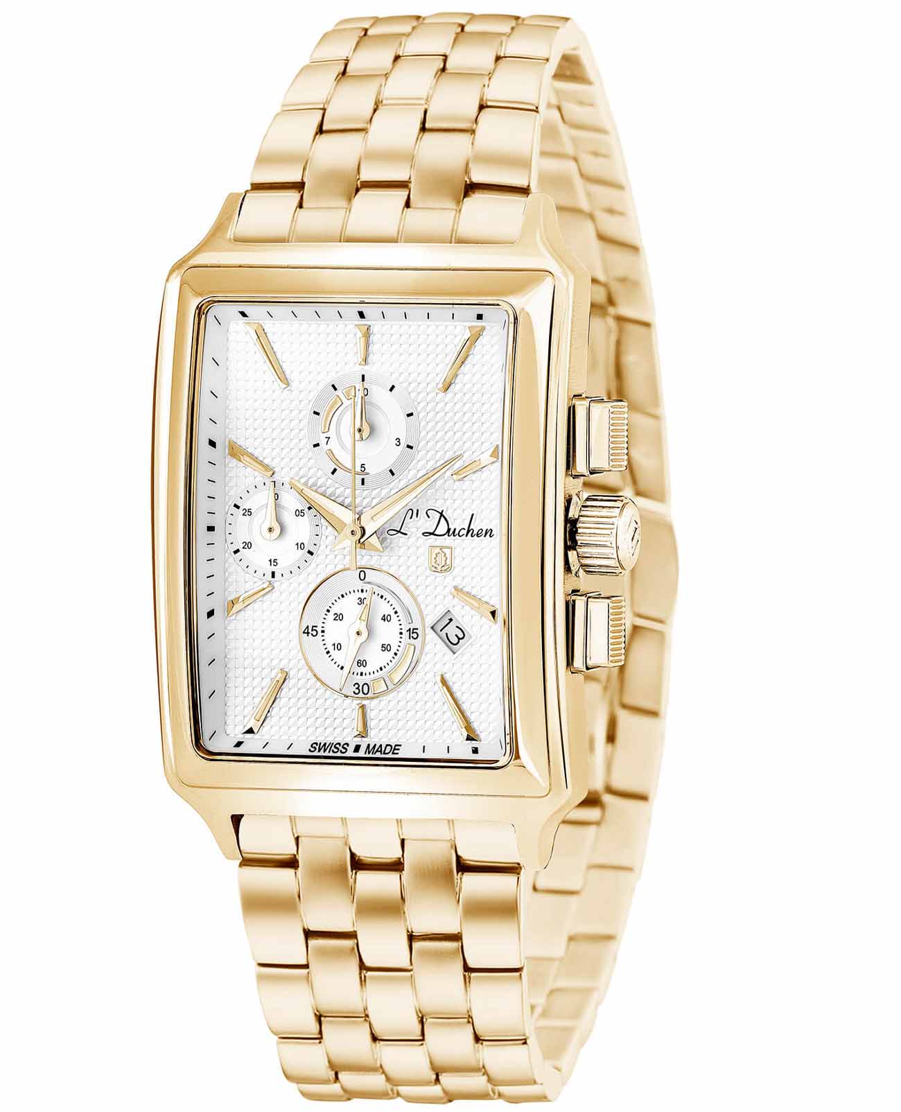 Мужские швейцарские часы- хронографХронографФункция позволяет измерять отрезки времени с особой точностью: часы, минуты, секунды. Верным признаком хронографа является наличие на циферблате 3 дополнительных окошек-счётчиков. L'Duchen Adventure Chrono D 612.20.33, кварцевый механизм с высокой точностью. Сапфировое стеклоСапфировое стеклоПрочный и надёжный материал из кристалла сапфира синтетического происхождения, характеризующийся особой твёрдостью и устойчивостью к царапинам и повреждениям. устойчивое к появлению царапин, обладающее высокой прозрачностью. Корпус часов выполнен из нержавеющей стали с PVD-покрытиемPVDУльтратонкое покрытие наносится в технике вакуумного напыления, сочетает в себе нитрид титана особой прочности со слоем золота или оксида хрома. Несёт в себе декоративную или защитную функцию.. Стрелки с люминесцентным покрытиемЛюминесцентное покрытиеПозволяет считывать показания времени в темноте. Производители наносят на стрелки, часовые индексы, безель или поверхность циферблата светонакопительный состав, дающий холодное свечение.. Окошко даты находится в положении между 4 и 5  часами. Класс водозащиты: 50 метров, позволит защитить корпус от случайных брызг или капель дождя. Стальной браслет с PVD-покрытиемPVDУльтратонкое покрытие наносится в технике вакуумного напыления, сочетает в себе нитрид титана особой прочности со слоем золота или оксида хрома. Несёт в себе декоративную или защитную функцию. на застёжке «бабочка» с кнопкамиЗастёжка "бабочка"Такой вид застёжки дополняется предохранителями, помогающими избежать случайного раскрытия браслета. Обладают изящным исполнением. .