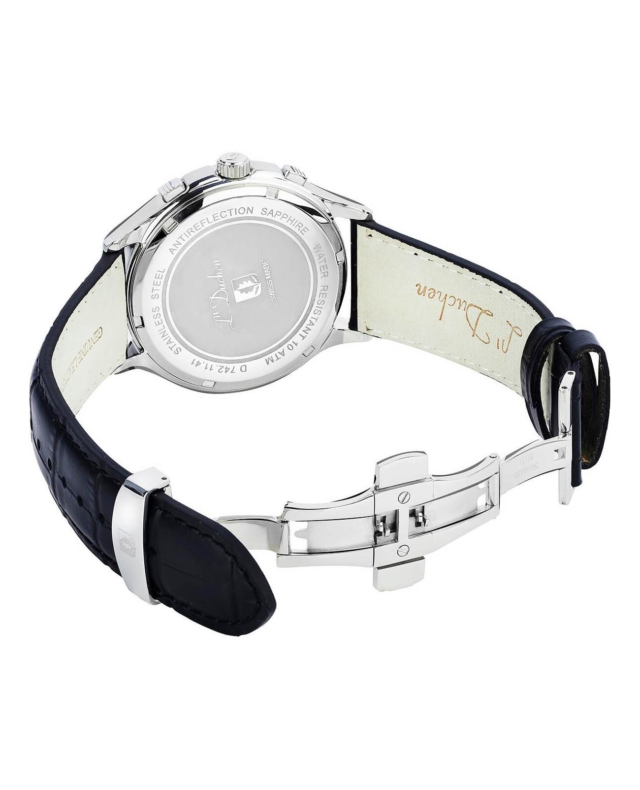 Мужские швейцарские часы- хронографХронографФункция позволяет измерять отрезки времени с особой точностью: часы, минуты, секунды. Верным признаком хронографа является наличие на циферблате 3 дополнительных окошек-счётчиков. L'Duchen Pilotage D 742.11.43, кварцевый механизм с высокой точностью. Сапфировое стеклоСапфировое стеклоПрочный и надёжный материал из кристалла сапфира синтетического происхождения, характеризующийся особой твёрдостью и устойчивостью к царапинам и повреждениям. устойчивое к появлению царапин, обладающее высокой прозрачностью. Корпус часов выполнен из нержавеющей стали. Стрелки с люминесцентным покрытиемЛюминесцентное покрытиеПозволяет считывать показания времени в темноте. Производители наносят на стрелки, часовые индексы, безель или поверхность циферблата светонакопительный состав, дающий холодное свечение.. Класс водозащиты: 100 метров, позволит плавать, нырять и заниматься другими водными видами спорта. Кожаный ремешок на застёжке «бабочка» с кнопкамиЗастёжка "бабочка"Такой вид застёжки дополняется предохранителями, помогающими избежать случайного раскрытия браслета. Обладают изящным исполнением. .